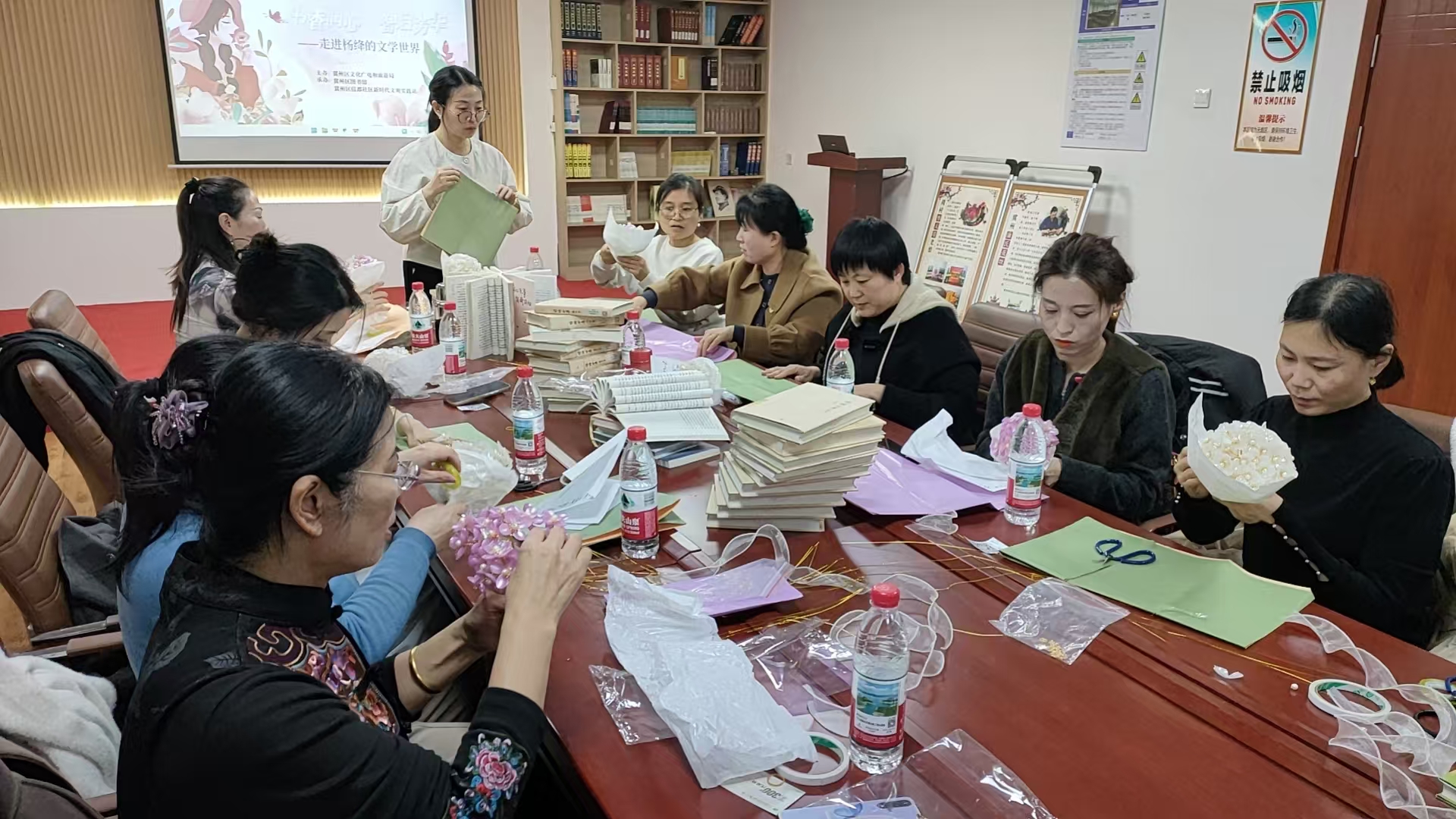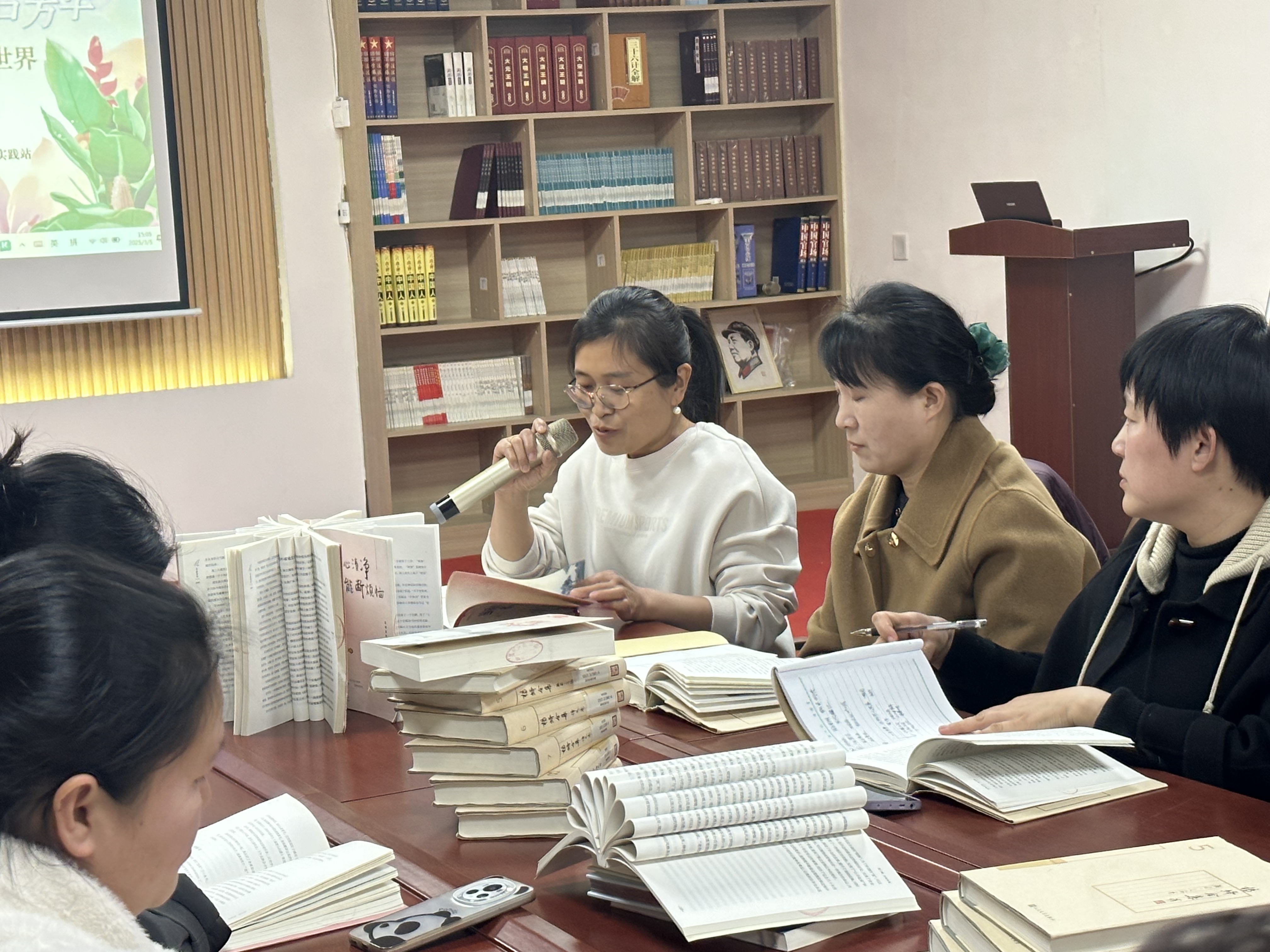 活动现场,主持人引领众人共同致敬中国现代文坛的璀璨明星——杨绛先生。在这温馨和谐的节日氛围中,妇女姐妹们围坐一堂,桌上整齐摆放着杨绛先生《我们仨》《走到人生边上》《洗澡》等著作。大家共同品味书香,分享阅读感悟,共话人生智慧。