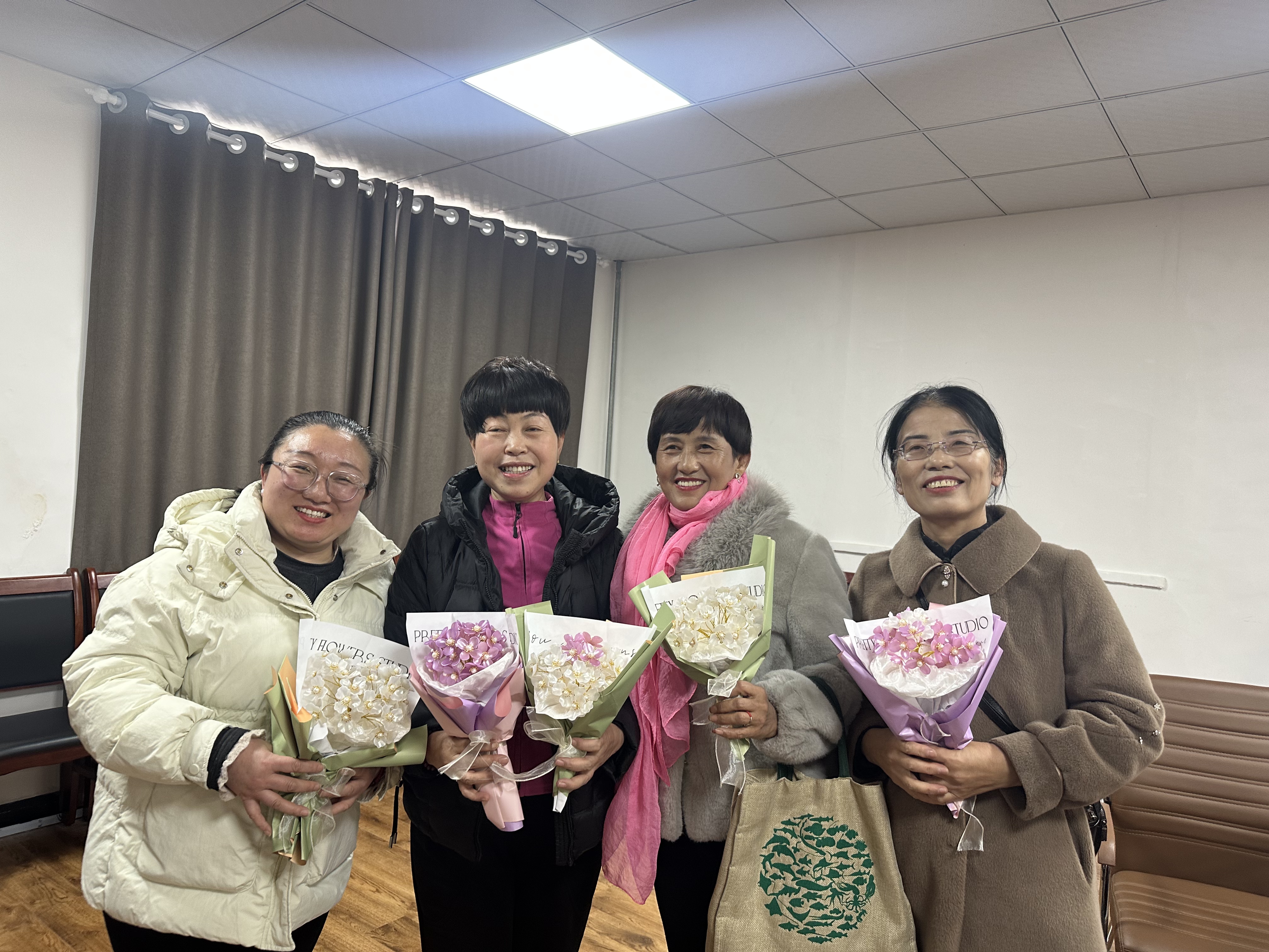 为增添节日仪式感与乐趣,活动特别增设DIY玉兰花环节。在志愿者老师的悉心指导下,大家小心翼翼地挑选着花瓣,用细铁丝将其固定成花朵的形状,再用绿色胶带缠绕铁丝以模拟花枝,最后将一朵朵精美的玉兰花错落有致地绑扎在事先准备好的花枝上,并点缀上绿叶和彩带,使其更加生动逼真。居民们看着自己亲手制作的花艺作品,脸上洋溢着满意的笑容。