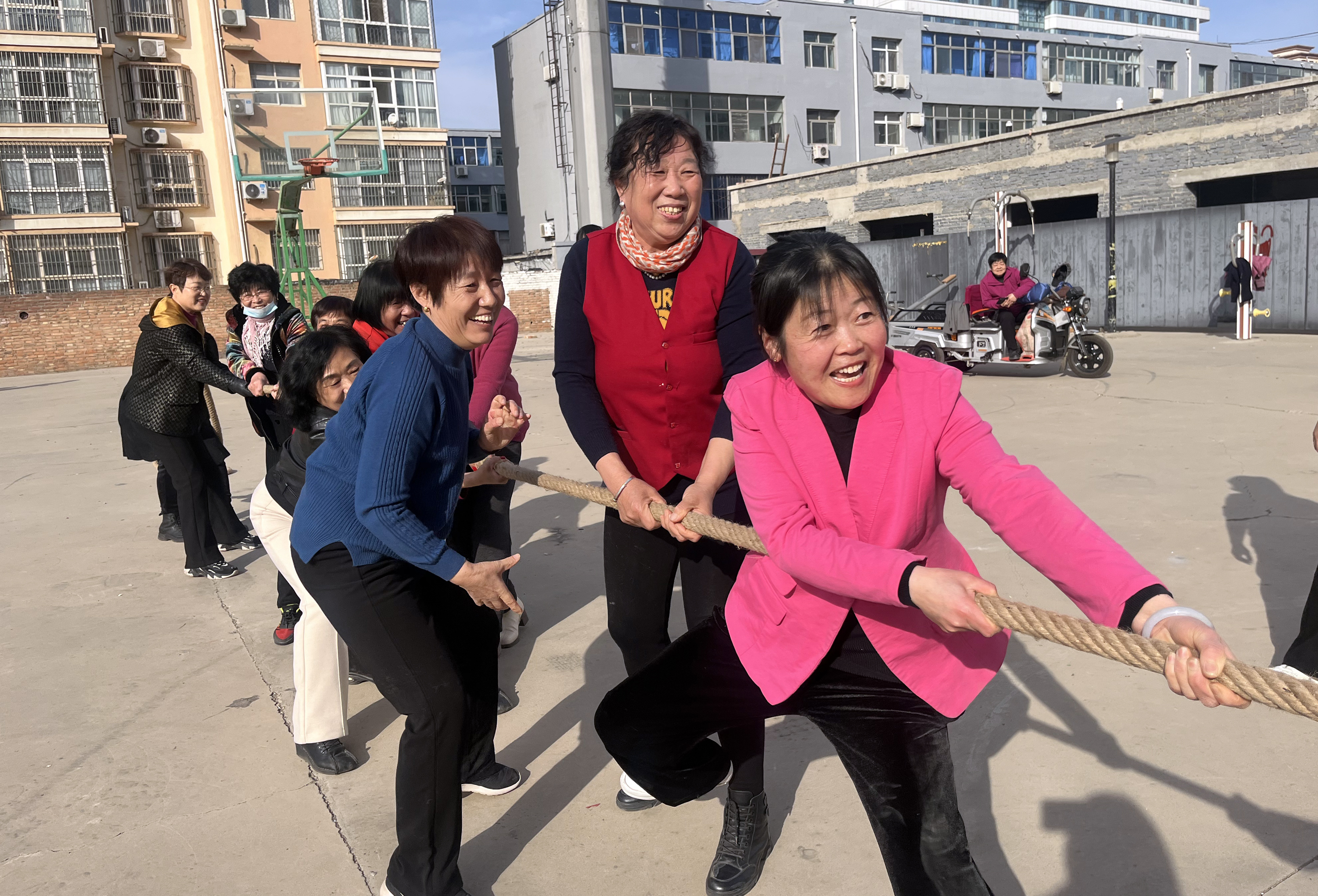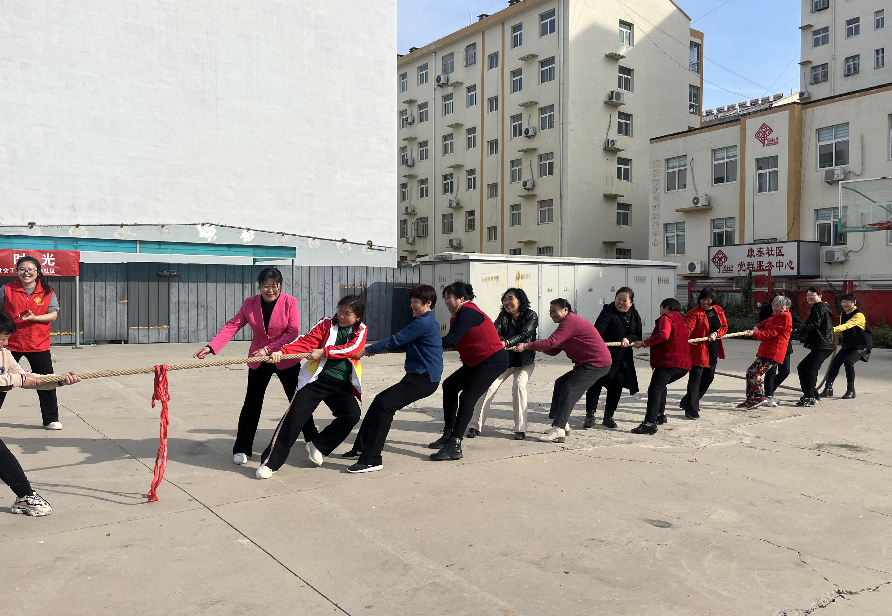 活动现场热闹非凡,充满了童年的气息。踢毽子、跳房子、丢手绢等经典儿时游戏一一呈现,成功唤起了居民们的童年回忆。踢毽赛场上,选手们动作矫健,小小的毽子如同彩蝶般在空中飞舞,赢得了观众的阵阵喝彩;跳房子区域内,孩子们脚步轻盈,在方格间欢快跳跃,踏出了美妙的节奏;丢手绢游戏中,手绢在小伙伴们之间快速传递,欢声笑语回荡在社区的每一个角落。而拔河比赛更是将现场气氛推向了高潮,两队居民口号响亮,齐心协力,奋力拉扯绳子,充分展现出强大的团结力量。