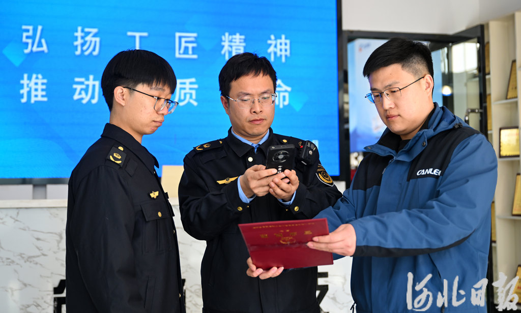 3月4日,在河北创力机电科技有限公司,邢台市市场监督管理局邢台经济开发区分局执法人员进行检查前,先使用“邢台执法”手机App扫描公司营业执照上的二维码,向全市行政执法和行政执法监督一体化平台“云备案”。河北日报记者 赵永辉摄