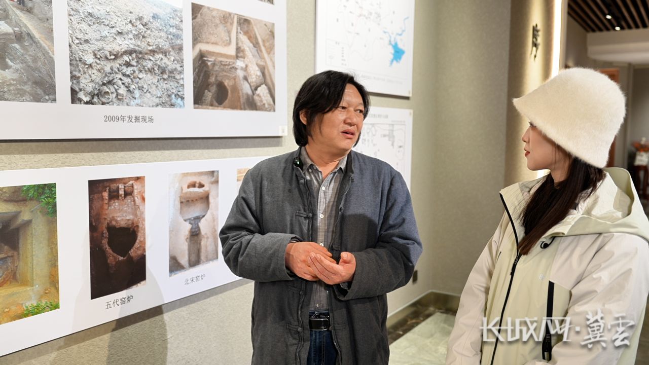 庞永辉(图左)为记者介绍定瓷历史。长城网·冀云客户端记者 姜家伟 摄