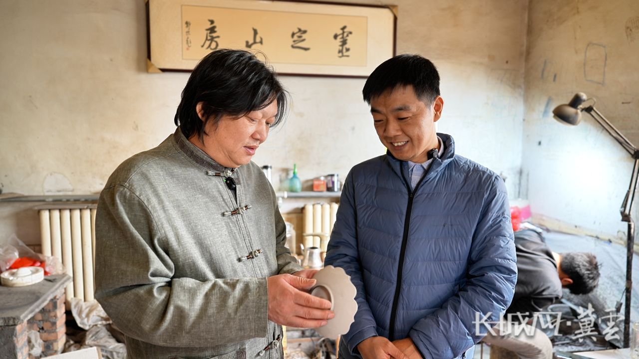 庞永辉与曲阳县定瓷工匠韩江潮(图右)研讨定瓷技艺。长城网·冀云客户端记者 姜家伟 摄