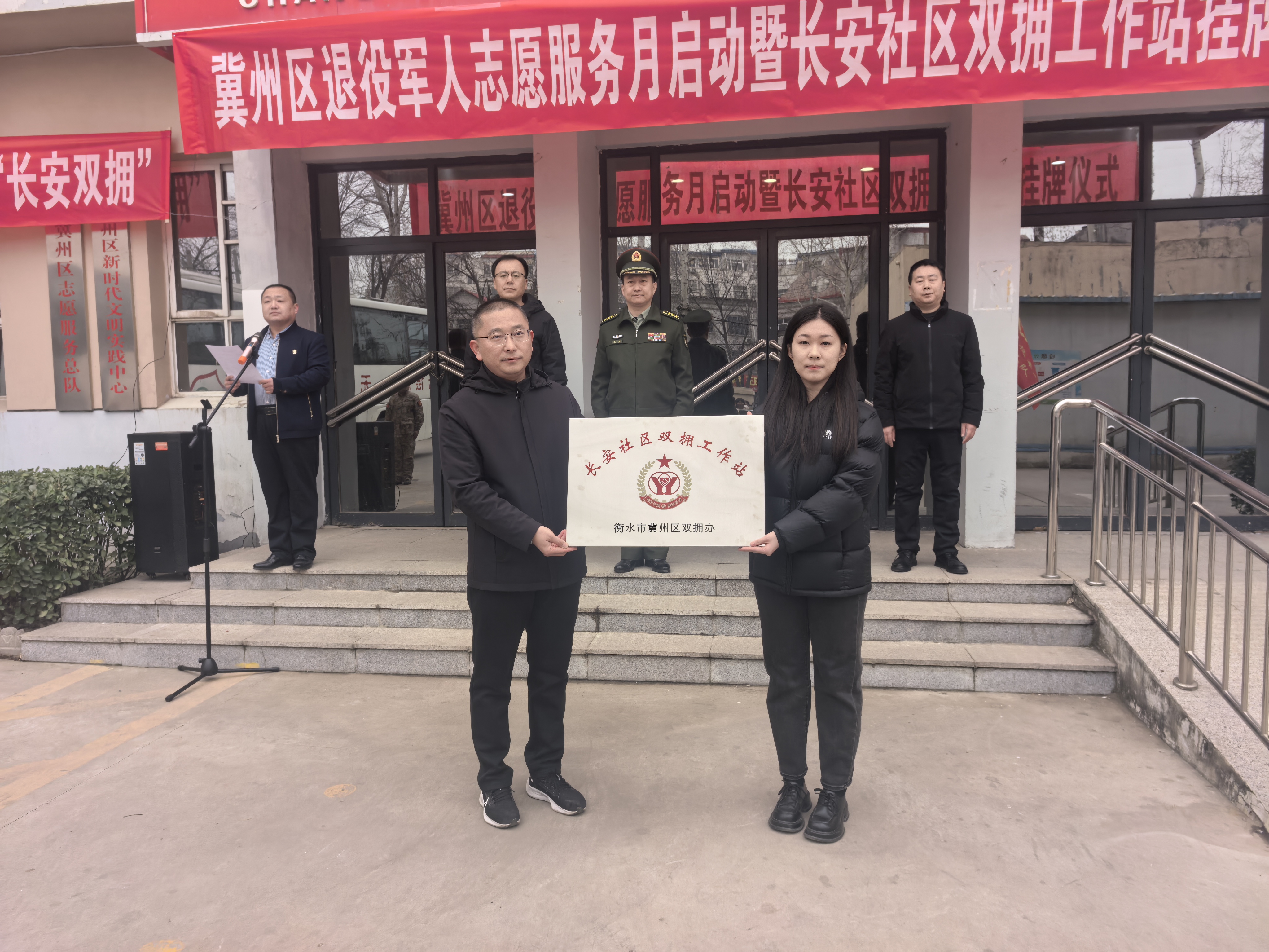 3月7日,衡水市冀州区退役军人志愿服务主题月启动暨长安社区双拥工作站授牌仪式举行。区人武部、区委社工部、区退役军人事务局、长安社区、退役军人代表、志愿者代表等近百人参加活动。