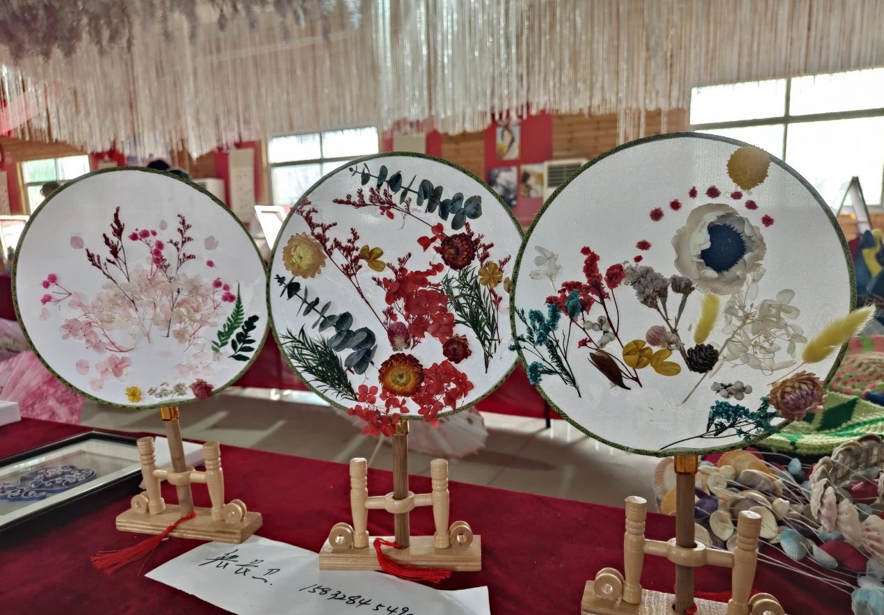 展览中,非遗剪纸、布雕画、琉璃簪花等手工艺品精美绝伦,让人爱不释手。知名画家刘竹铭的书法和篆刻作品,具有较高的艺术价值和收藏价值;民俗画家刘现辉的作品生动勾勒出衡水本地的生活万象和文化脉络;乡村女性绘画作品则展示了现代女性的独特魅力。除此之外,特色手工制作京剧布兜、栩栩如生的传统布艺老虎鞋、细致精巧的芦苇画、精巧别致的盘扣工艺画、创意新颖的毛线毡绣作品,还有鱼灯、布鞋、刺绣鞋垫等精美手工艺品,琳琅满目,令人目不暇接。室外的农产品交易摊位上整齐地摆放着蔬菜、面条、酱醋以及武邑县的特色电商产品,也吸引了不少村民前来选购。