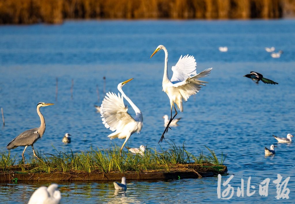 在衡水湖,退耕还湿、生态补水,白鹭与灰鹤共舞,湖水如镜映照出生态修复的奇迹。