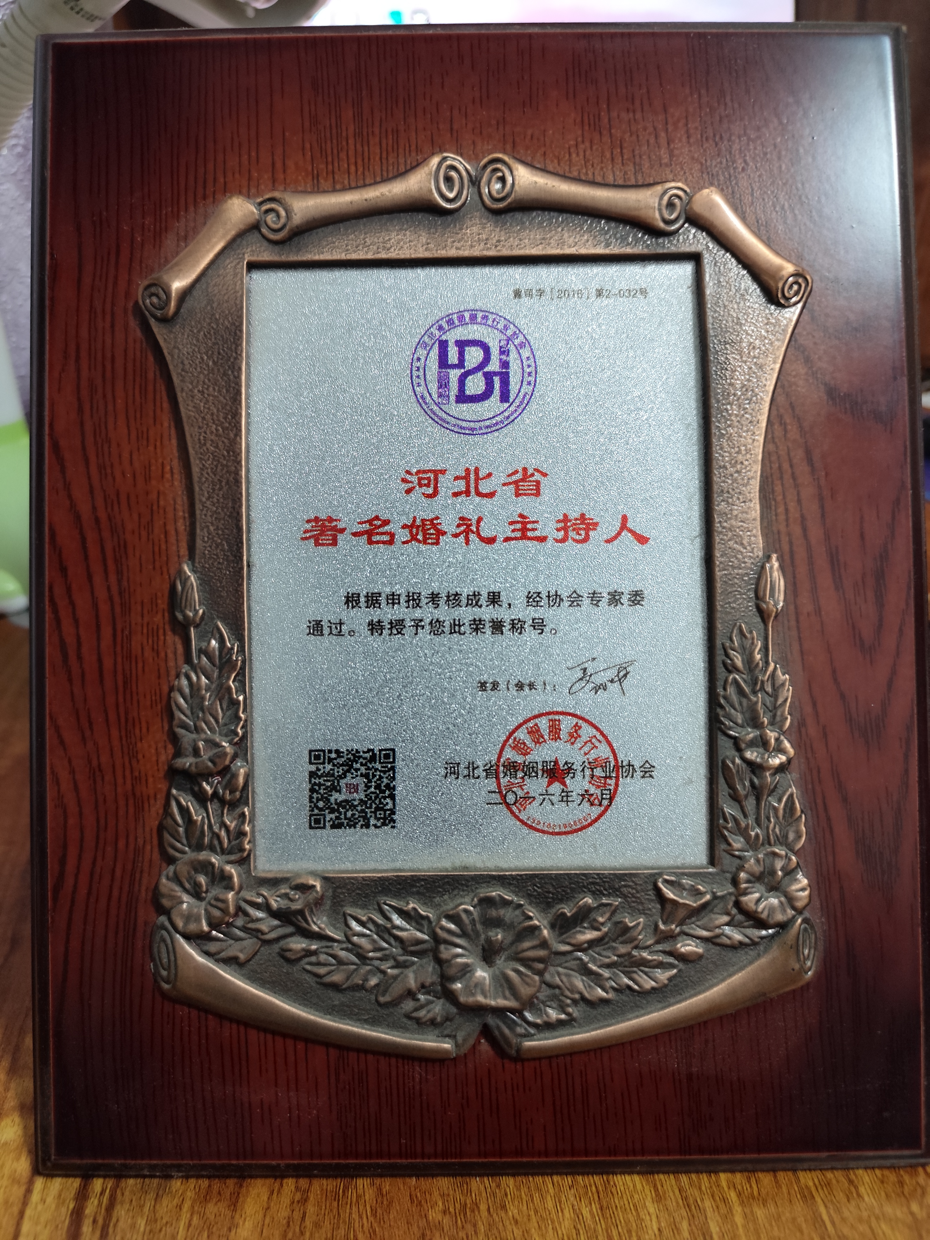 河北省著名婚礼主持人奖牌。 张占祥 摄