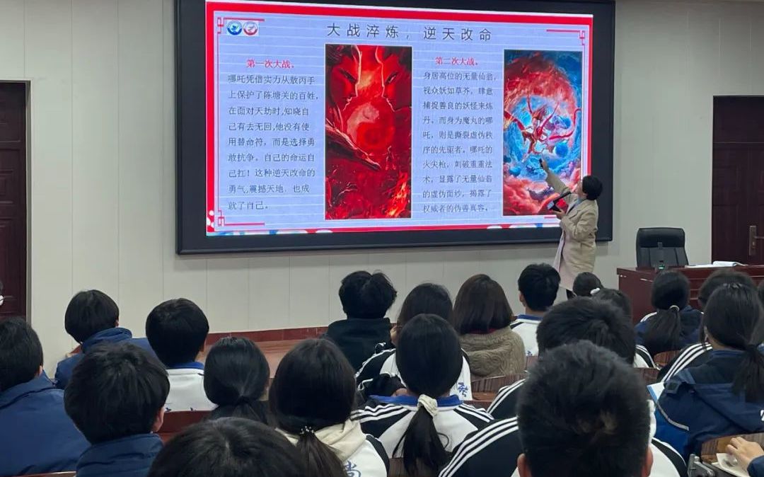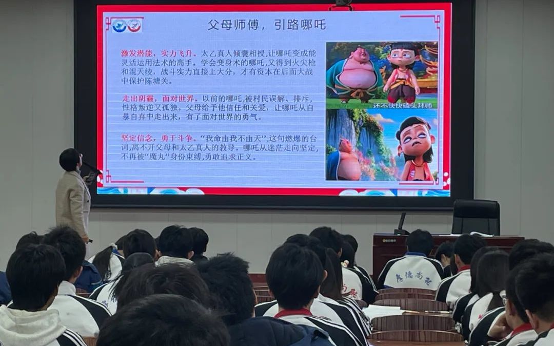 随后,张老师围绕哪吒的成长经历,深刻剖析了哪吒精神的丰富内涵,如不屈从于命运、勇于抗争、保持善良真诚等崇高品质。她从“撕掉标签”、融入集体生活以及设定学习目标三个维度,对哪吒的成长密码进行了深入浅出的解读。