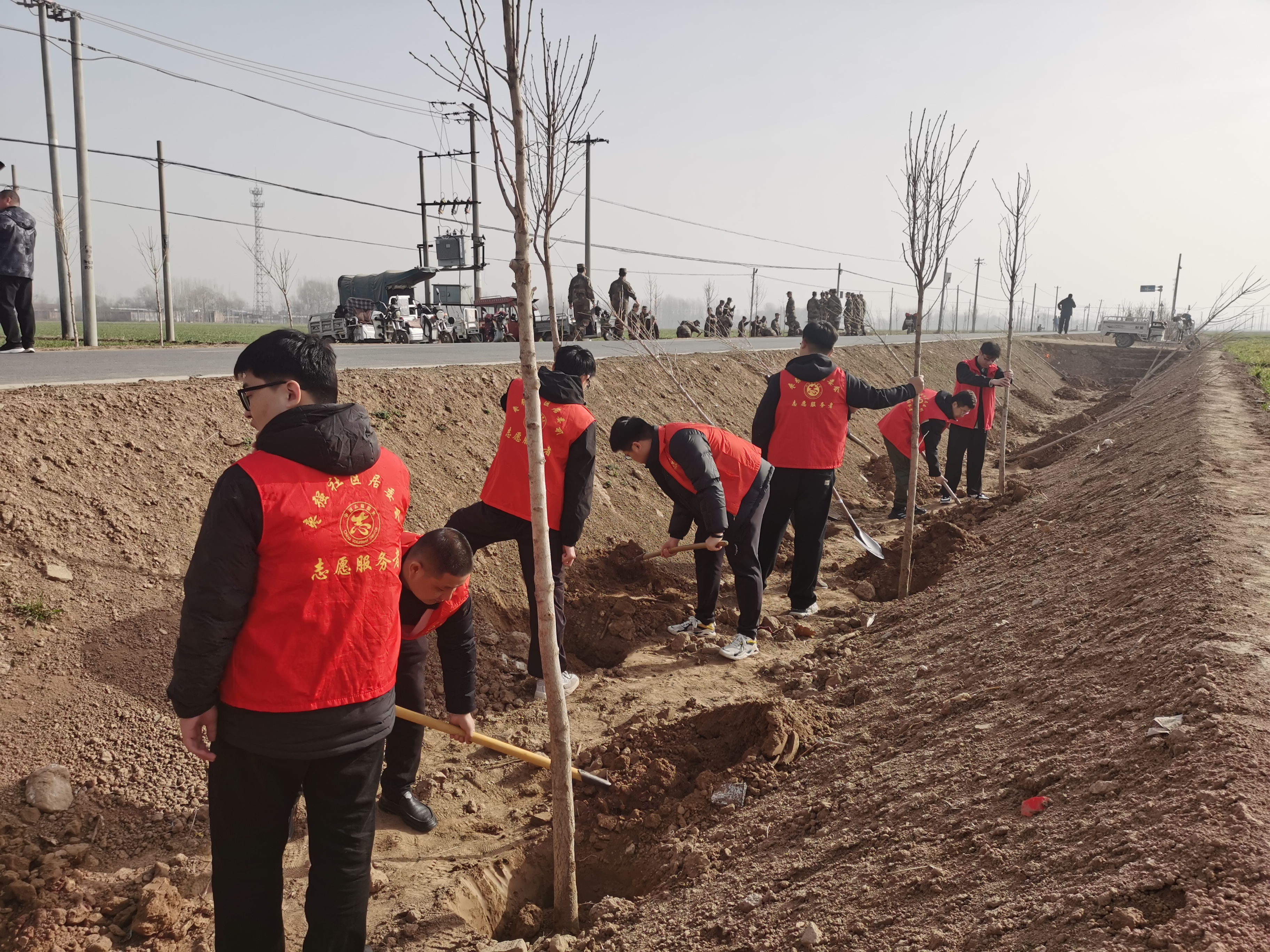 植树现场一派繁忙景象,志愿者们干劲十足,分工协作,配合默契。有的负责挖坑,他们挥汗如雨,铁锹翻飞,不一会儿,一个个标准的树坑便整齐排列开来;有的负责搬运树苗,他们小心翼翼地将银杏树苗从车上卸下轻放在一旁;还有的负责栽植,他们细心地将树苗放入坑中,回填土壤,再用脚踏实,最后浇水……在众人的共同努力下,400棵银杏树苗很快栽种完毕。随后,志愿者们转战下一个栽种处。