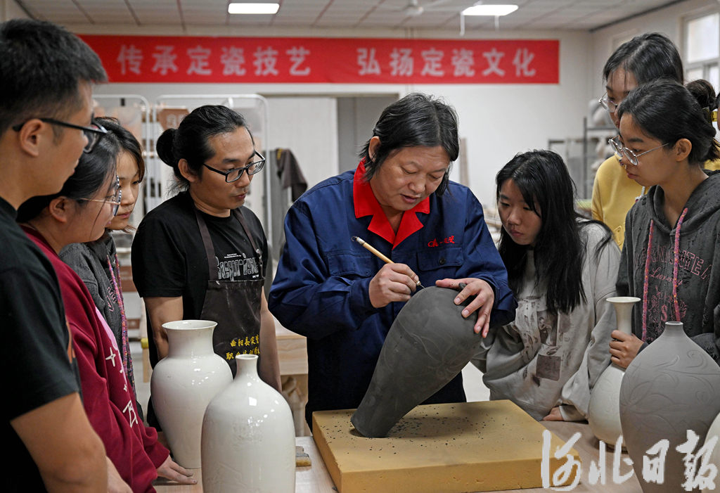 2024年10月14日,定瓷烧制技艺代表性传承人庞永辉(中)为河北美术学院学生做讲解。 河北日报记者 张 昊摄