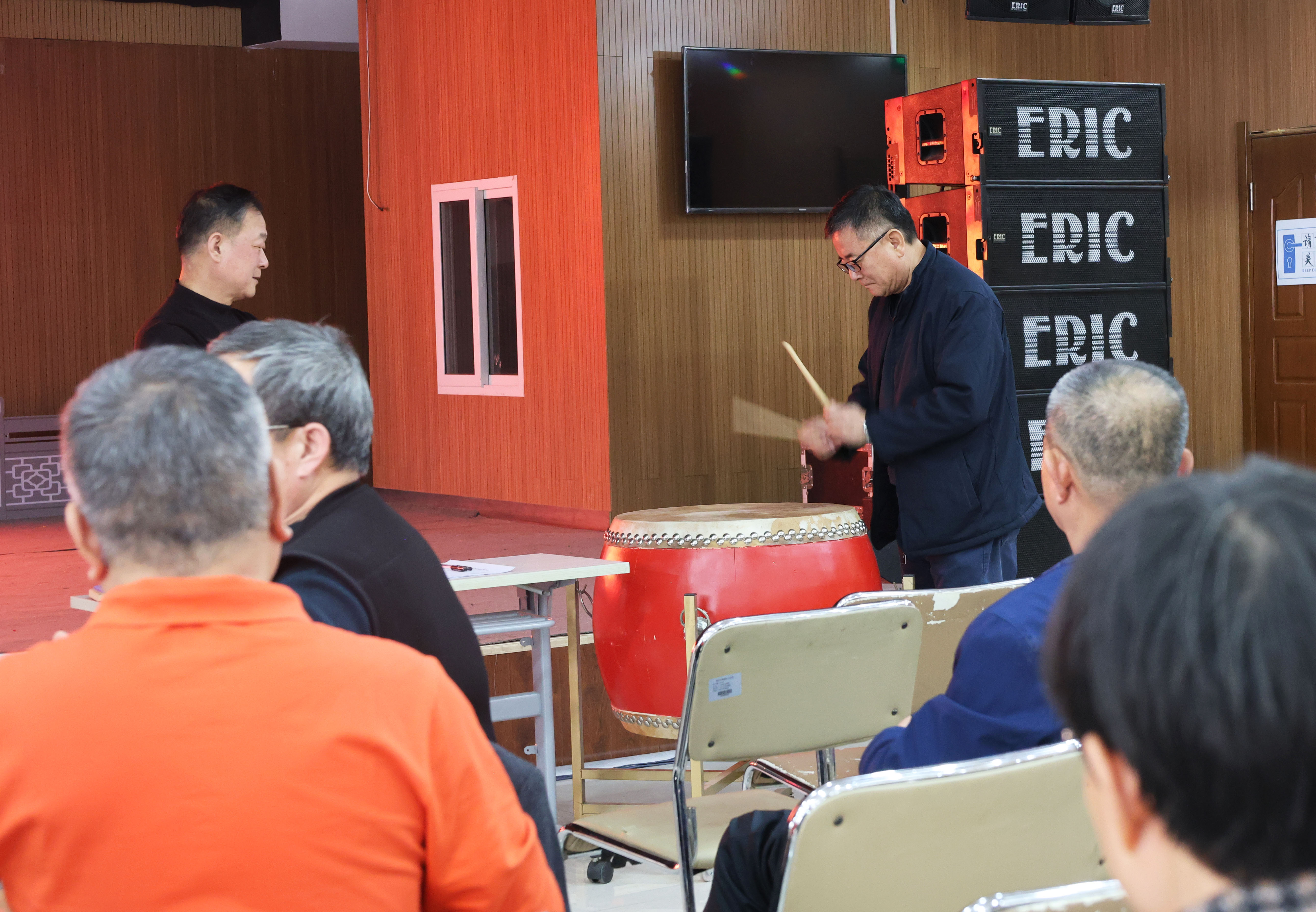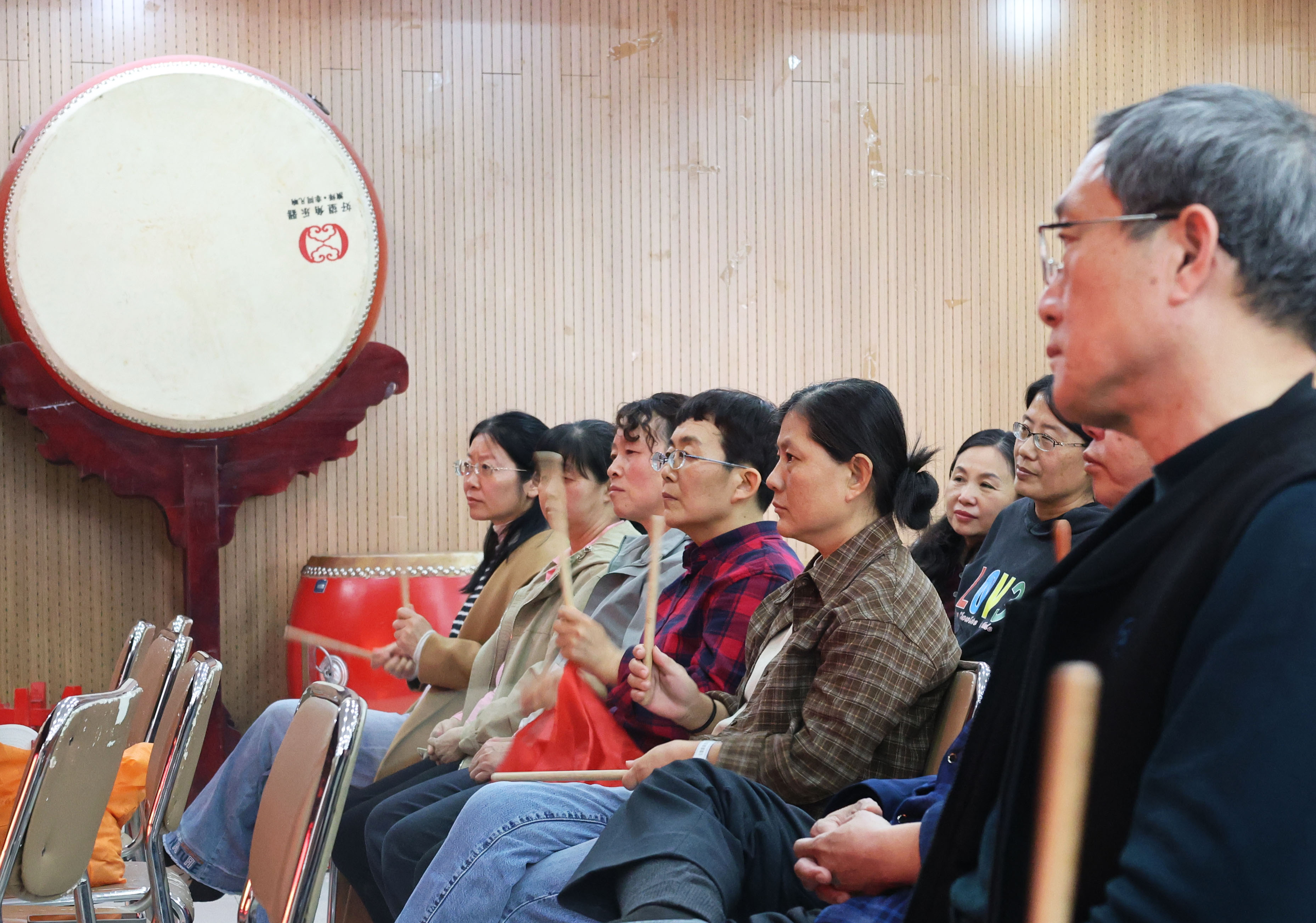 活动现场,民族鼓班的老师为辖区居民讲解民族鼓知识。从认识民族鼓的构造,到正确的鼓槌手势,老师一边耐心细致地讲解,一边进行标准的动作示范。大家听得津津有味,还兴致勃勃地跟着老师的节奏,手持鼓槌在空中认真模仿着老师的动作,随着鼓点兴致勃勃地打起节拍,现场气氛热烈而活跃。