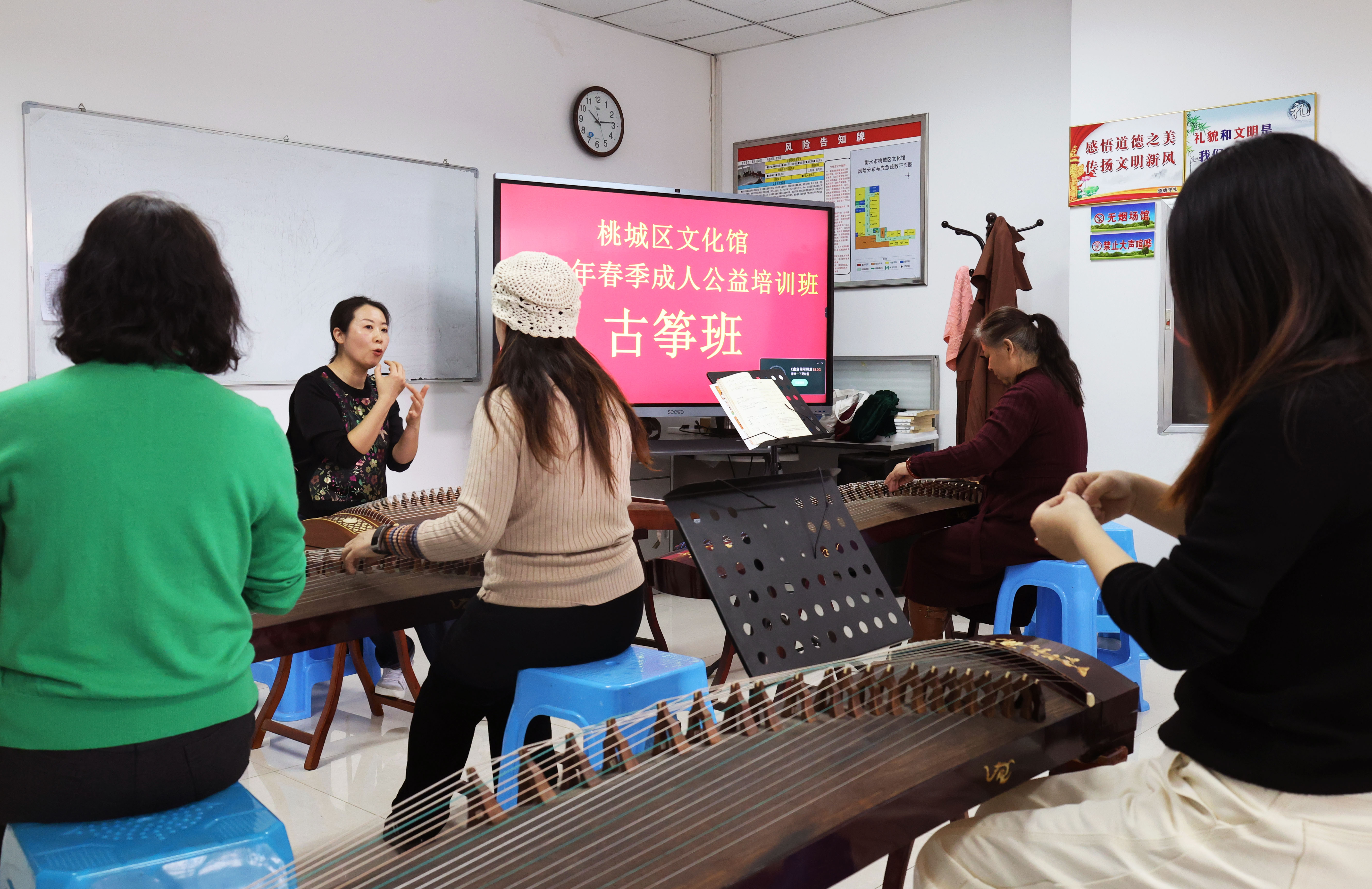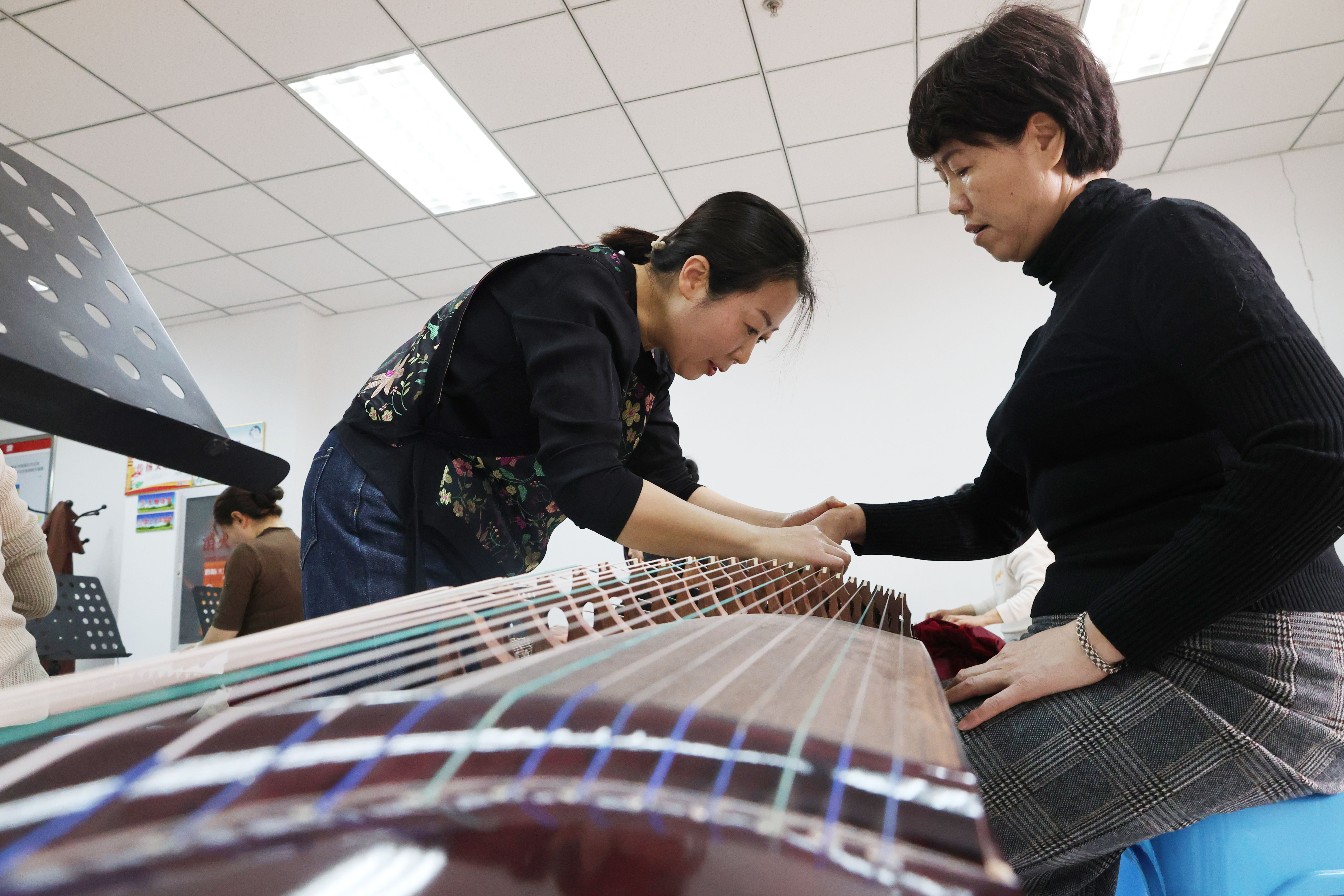 在隔壁的古筝培训教室,同样是一片专注学习的景象。培训课上,古筝老师从最基础的坐姿、手型教起,一招一式规范严谨,耐心引导学员们开启古筝艺术的探索之旅。学员们按照老师的指导,认真调整姿势,轻拨琴弦,尝试发出第一个音符,沉浸在古筝的美妙世界中。