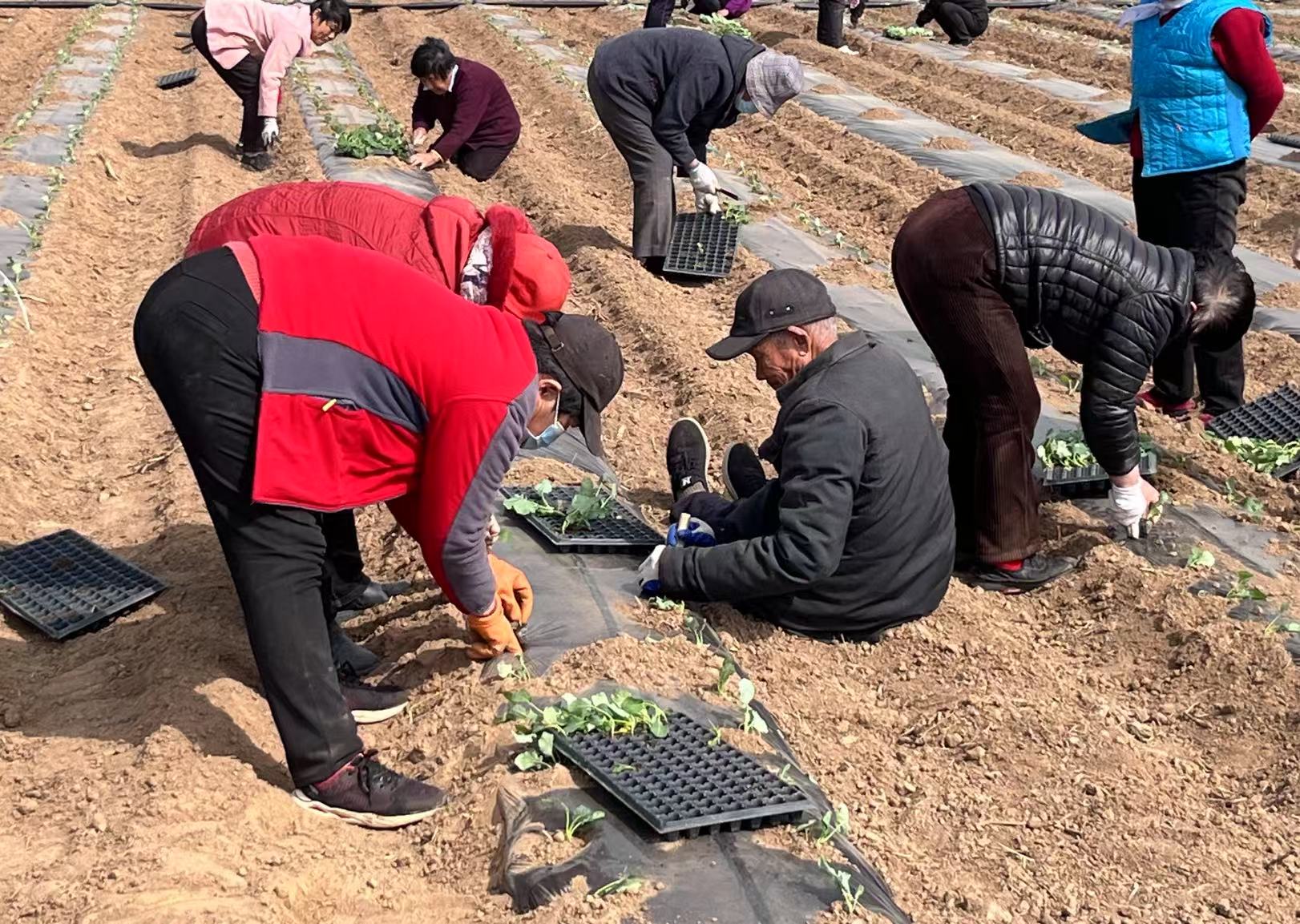 只见工人们正有序地进行着西兰花的移栽工作,一株株嫩绿的西兰花幼苗在春风中摇曳生姿,向人们展示着生命的活力。种植户许亚刚为了确保春季西兰花的顺利移栽,特意招募了30余名当地村民集中作业,不仅保证了移栽的及时性,也为周边群众提供了就近就业的机会。
