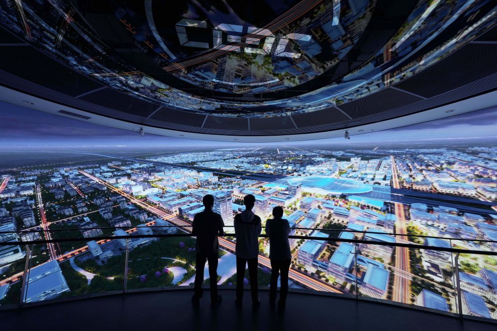2024年5月21日,在雄安新区雄安站枢纽片区的中国能建“能建·新能源生态城”项目展示区内,游客通过球形大屏了解园区概况。新华社记者 杨世尧 摄