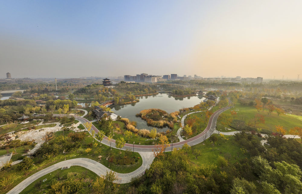 2024年11月7日拍摄的雄安新区悦容公园与雄安商务服务中心(无人机照片)。新华社发(落飞麟摄)