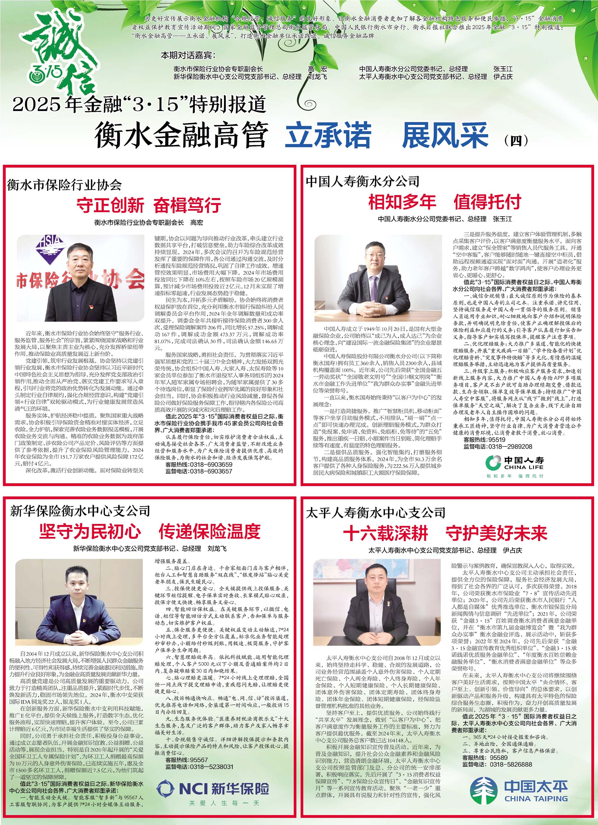 为更好宣传展示衡水金融机构“合规经营、诚信服务”的良好形象、让衡水金融消费者更加了解各金融机构特色服务和便民举措,“3·15”金融消费者权益保护教育宣传活动期间,国家金融监督管理总局衡水监管分局、中国人民银行衡水市分行、衡水日报社联合推出2025年金融“3·15”特别报道:“衡水金融高管—立承诺、展风采”,打造衡水金融单位承诺践诺、诚信服务金融品牌。