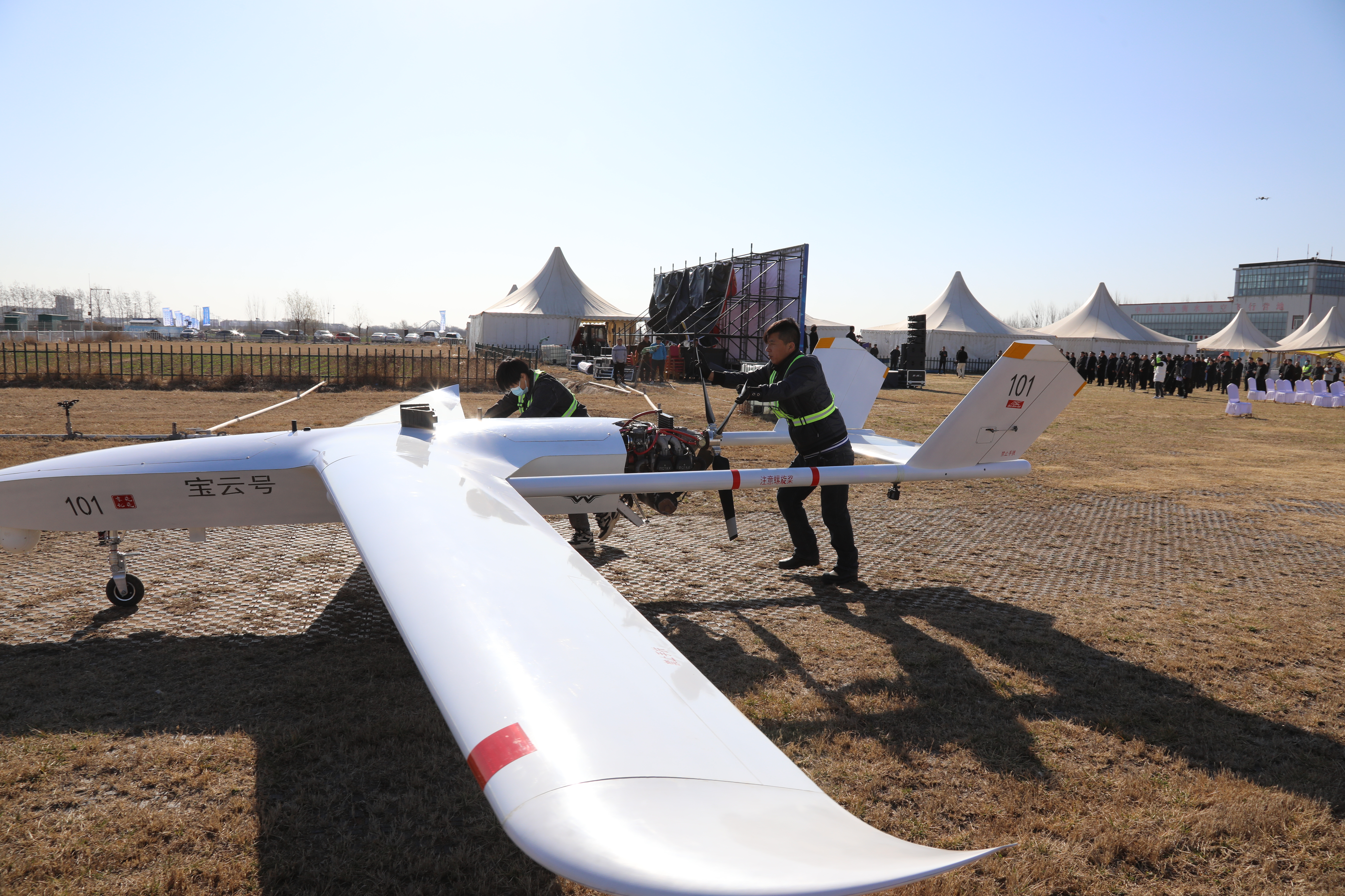 工作人员将“宝云号”长航时大载重无人运输机推上滑行道。薛涛 摄