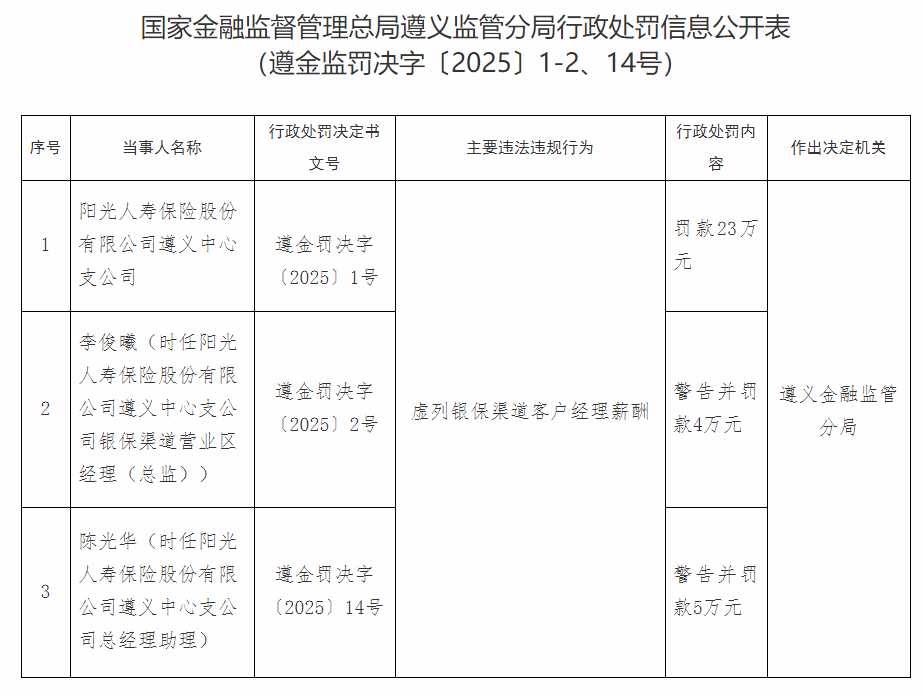 根据国家金融监督管理总局网站近日发布的行政处罚信息公开表(遵金罚决字〔2025〕1号、2号、14号)显示,因虚列银保渠道客户经理薪酬,国家金融监督管理总局遵义金融监管分局对阳光人寿保险股份有限公司遵义中心支公司罚款23万元。