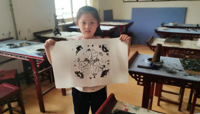 只见孩子们小心翼翼地将油墨涂抹在刻板上,确保每一处都均匀上色。然后,她们把纸张轻轻覆盖在刻板上,再用擦子轻轻按压。在这个过程中,孩子们全神贯注,屏气敛息,仿佛在进行一场神圣的仪式。