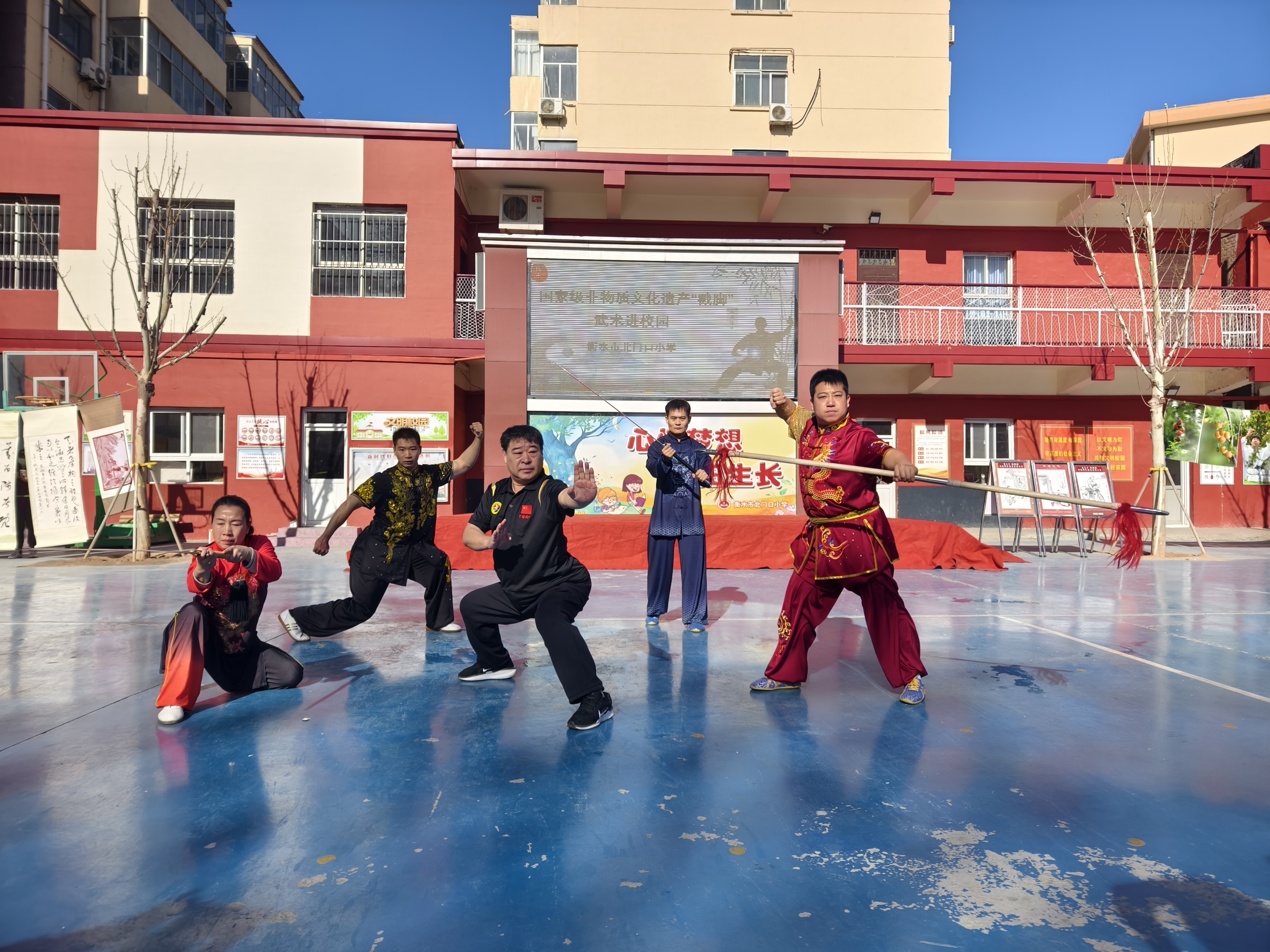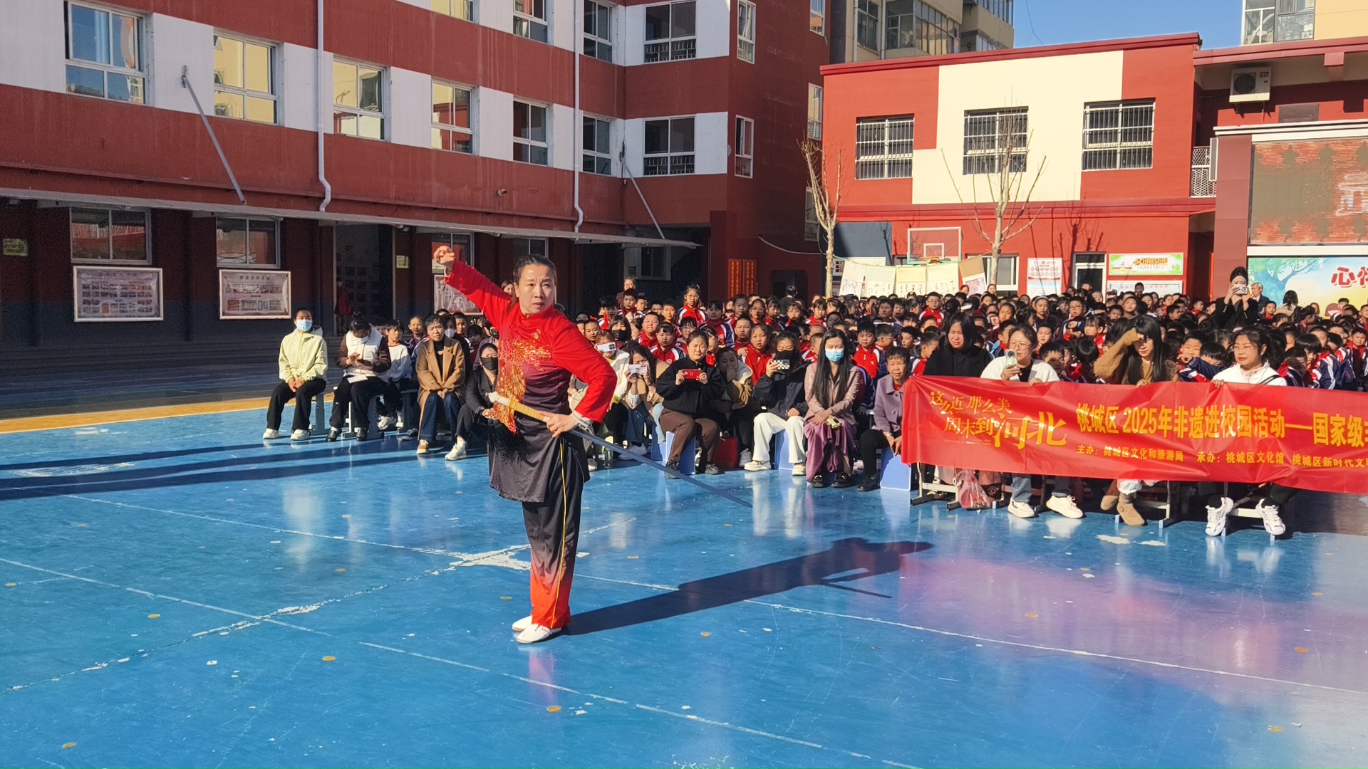 活动现场,国家级非物质文化遗产戳脚传承人宋君杰老师热情洋溢地向学生们介绍了戳脚武术的历史渊源,其独特的历史底蕴和深厚的文化内涵,引起学生们极大的兴趣。随后,宋君杰带领他的武术团队为学生们带来精彩的戳脚武术表演。队员们精神抖擞、动作矫健,展示了戳脚武趟子舒展大方、矫捷刚健的风格,以及文趟子架小紧凑、灵活善变的特点。他们一招一式刚劲有力,拳脚之间虎虎生风,戳脚双手剑更是上下翻飞,双头枪枪枪奇特,硬气功扣人心弦,让同学们看得目不暇接,现场不时爆发出阵阵热烈的掌声和欢呼声 。