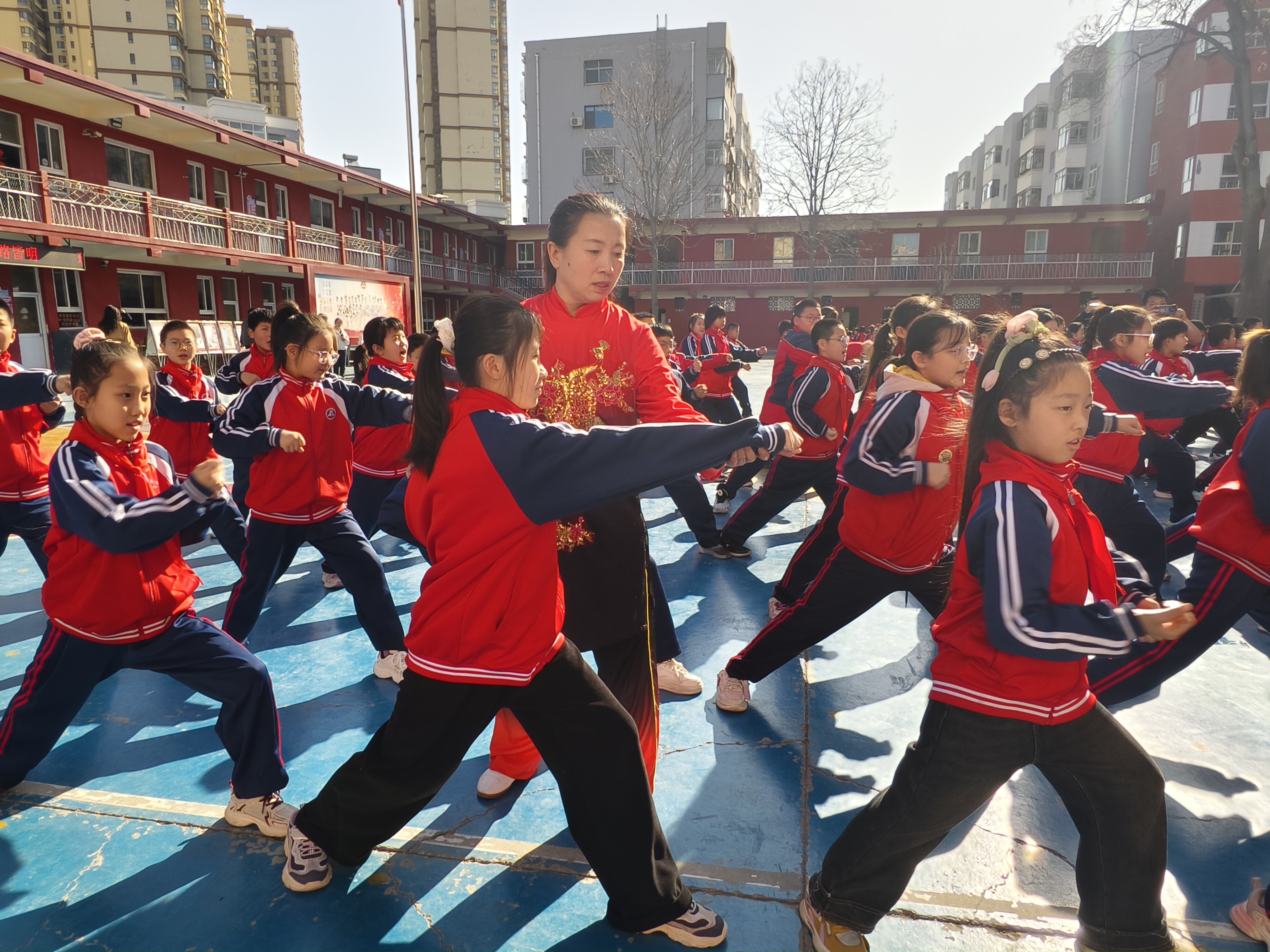 表演结束后,进入了互动教学环节。同学们纷纷踊跃上台,在武术教练们的耐心指导下,学习戳脚的基本动作和要领。尽管有些动作对于初次接触的同学们来说颇具难度,但大家都学得格外认真,一招一式有模有样。