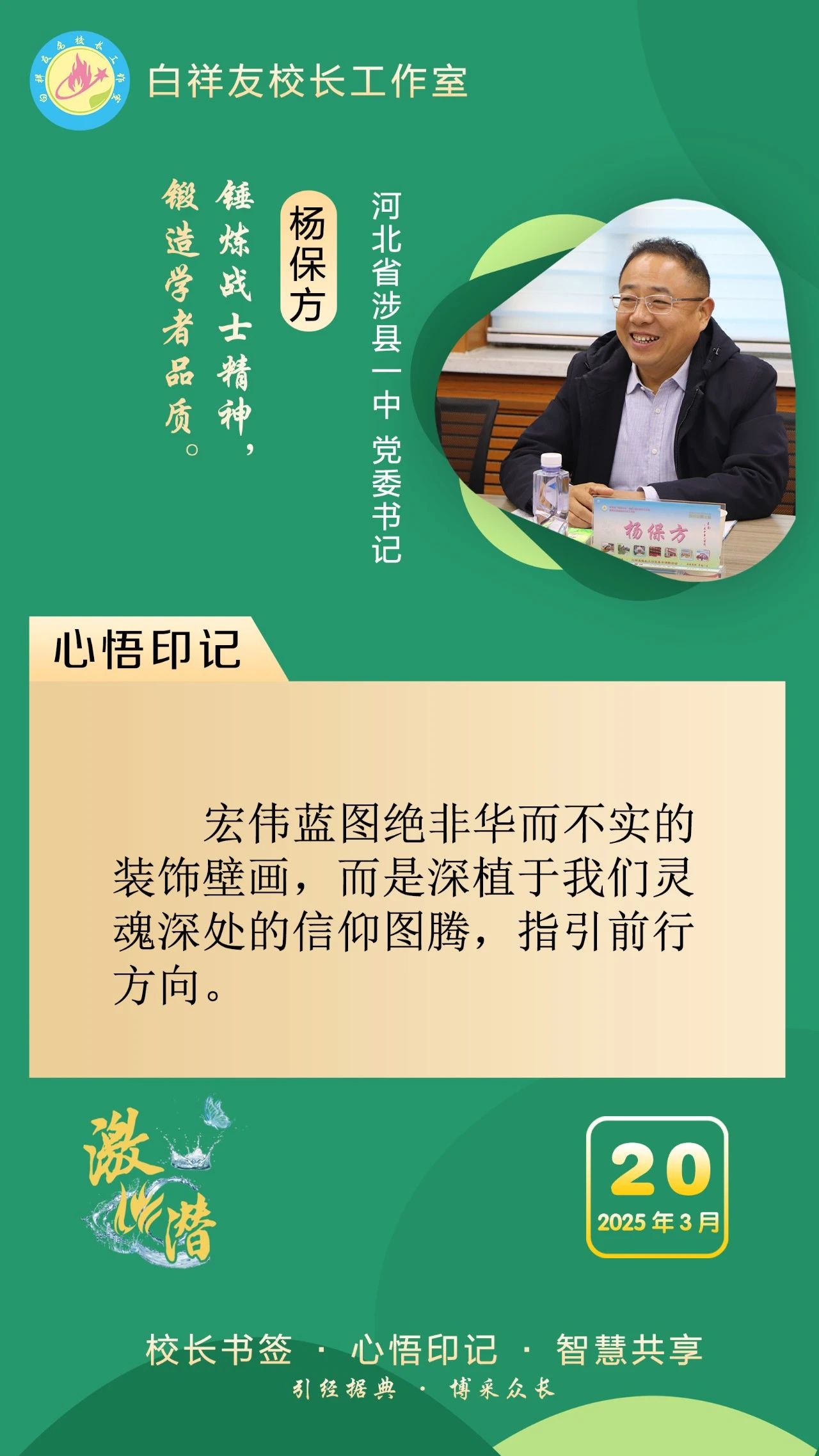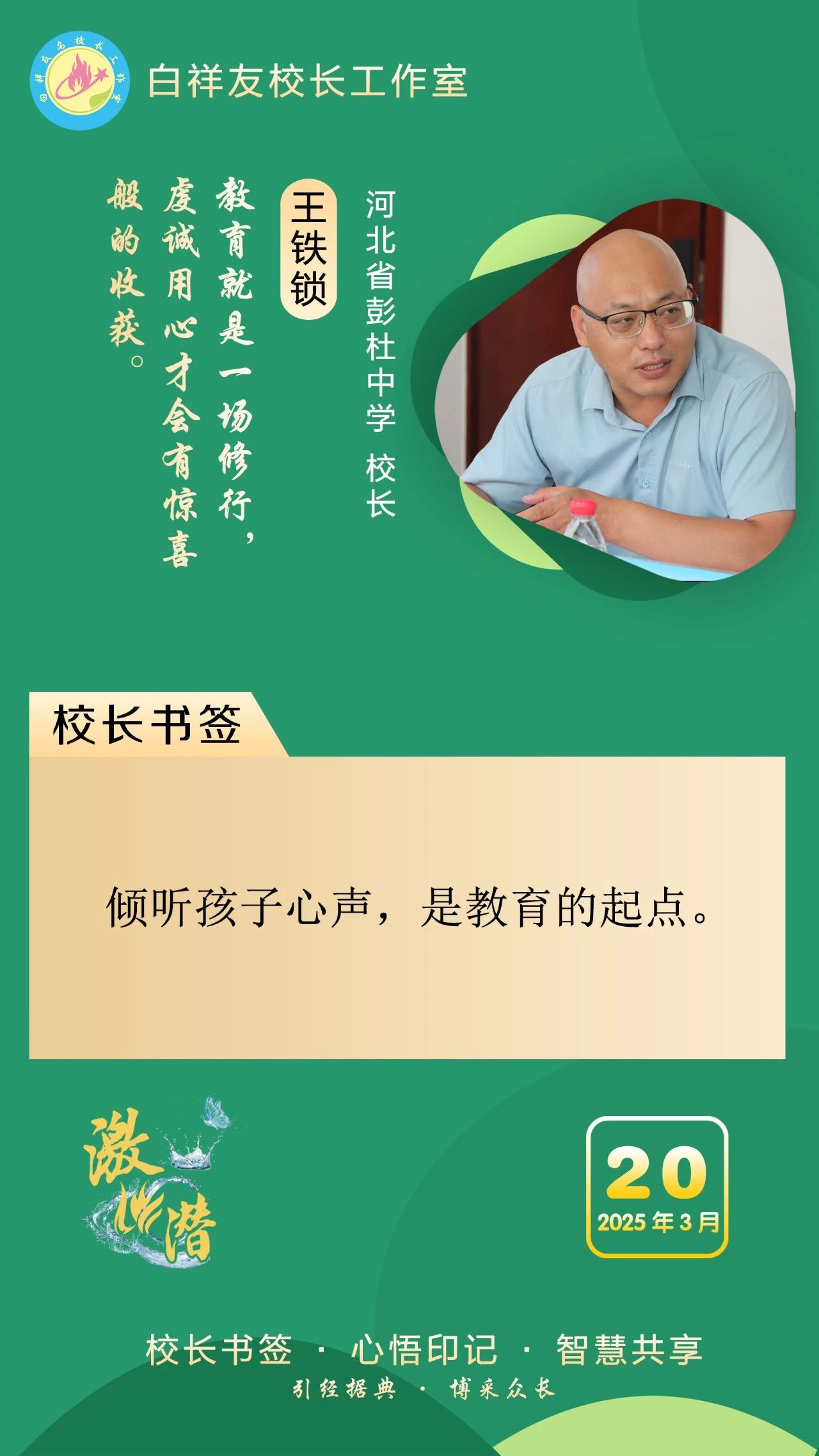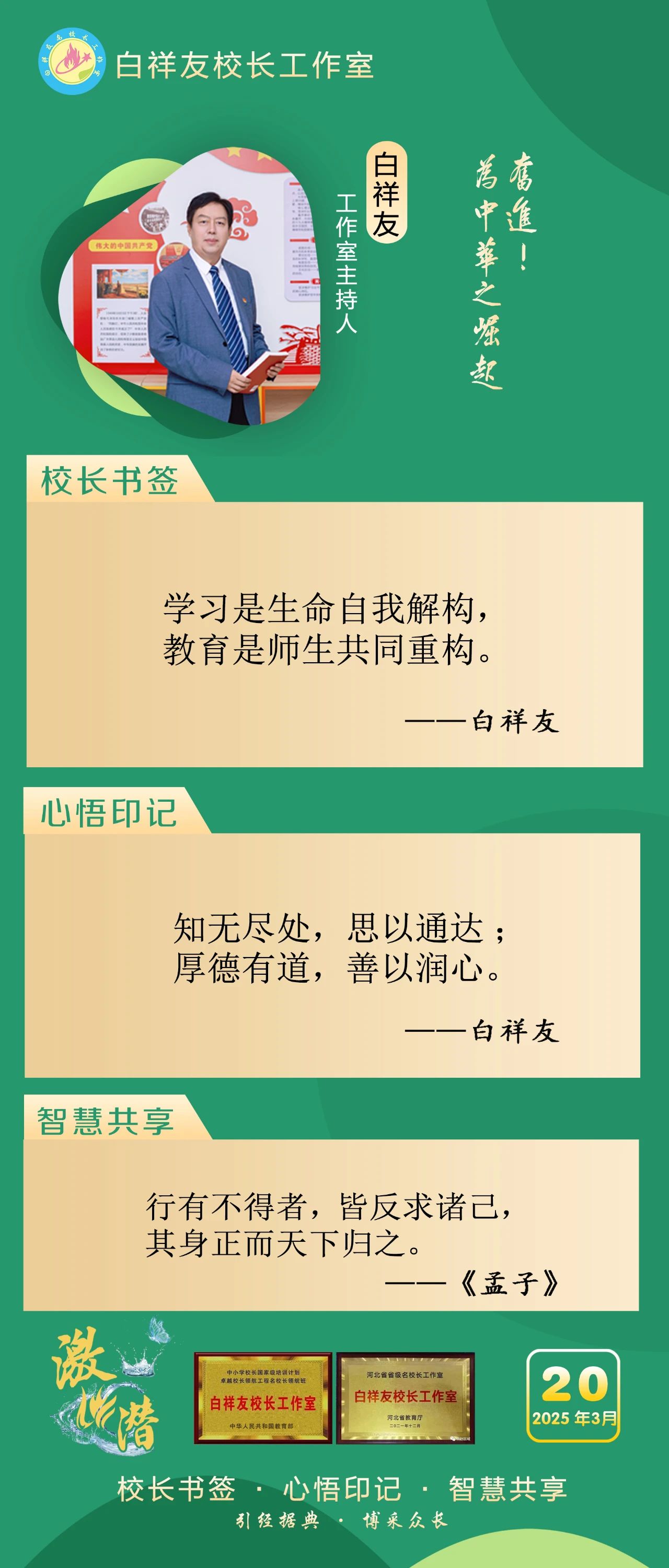 “白祥友校长工作室”成立于2019年4月,是教育部“国培计划”中小学名校长领航工程、河北省首批名校长工作室,目前省内外成员校56个。工作室坚持“资源共享、智慧共融、互助共赢”理念,已成为思想碰撞的交流场,资源共享的品牌站,成果展示的辐射源。