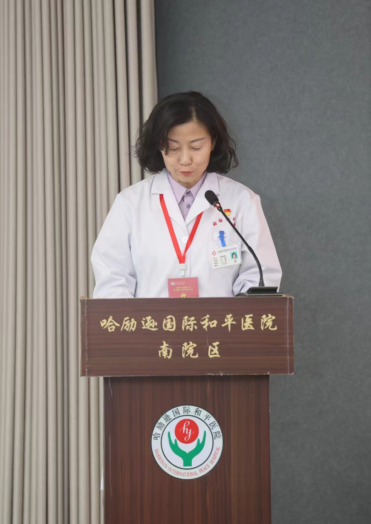 衡水市人民医院(哈励逊国际和平医院)工会主席杨新颖在医院第七届第一次会员代表大会上作工作报告。