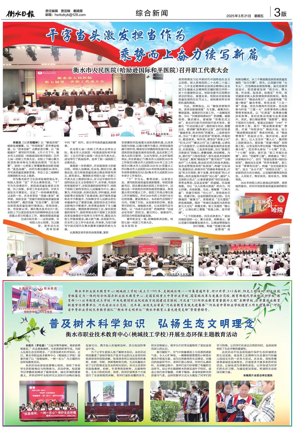 3月17日下午,衡水市人民医院(哈励逊国际和平医院)召开七届一次职工代表大会。这是在全面贯彻落实习近平新时代中国特色社会主义思想,深入贯彻党的二十大和二十届二中、三中全会精神和全国两会精神以及全国卫生健康大会精神的关键时期,召开的一次十分重要的会议。