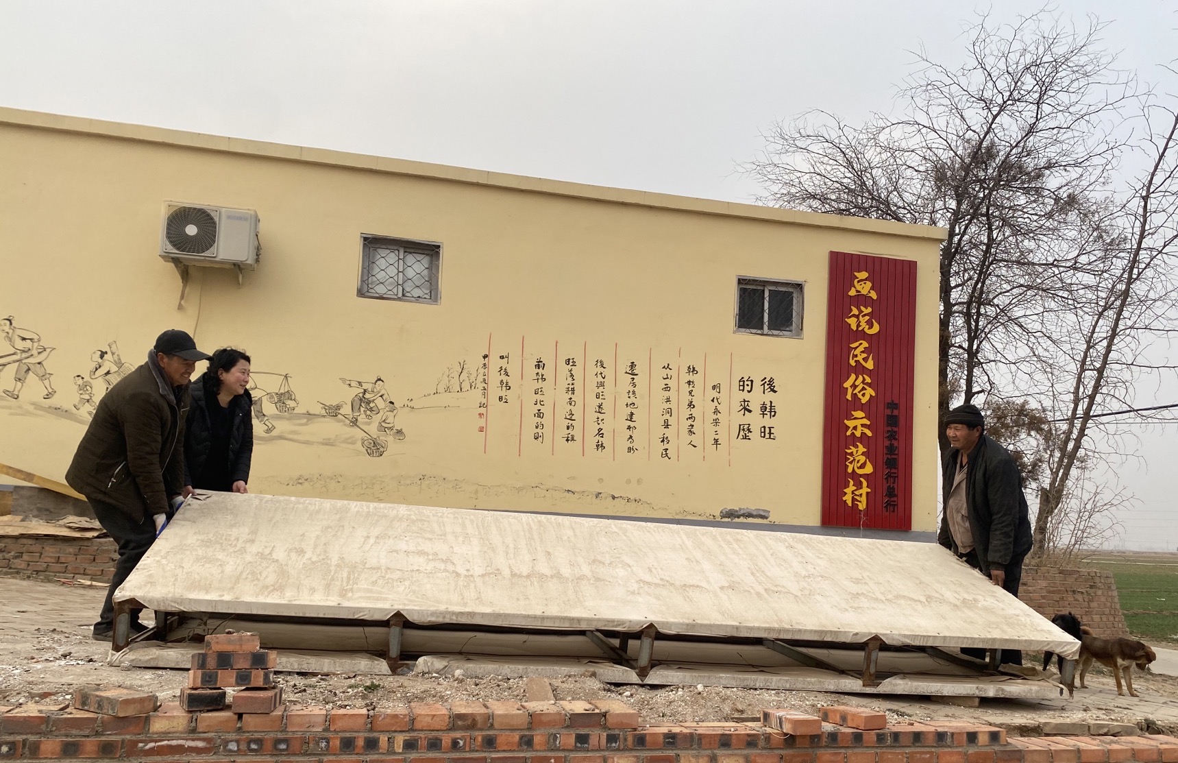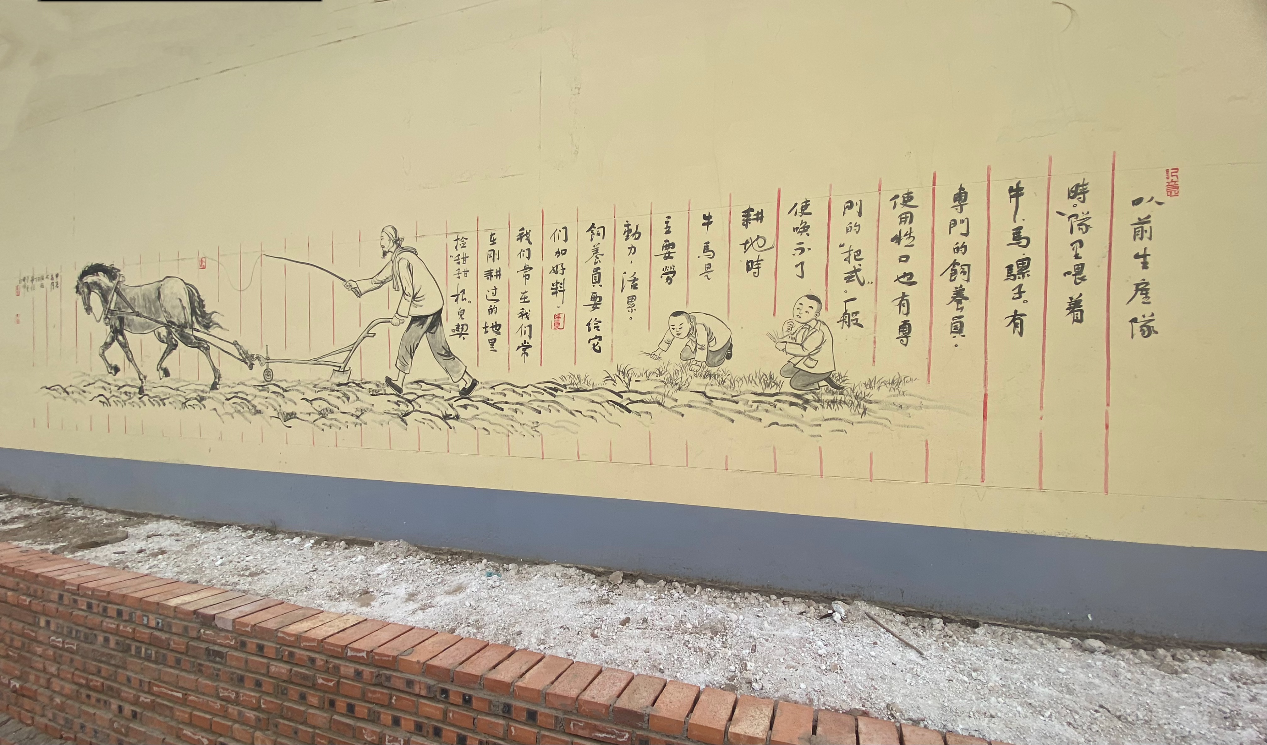 来到村口,“画说民俗示范村”的墙面上,后韩旺村的先辈赶车、挑担、奔赴至此落地生根的团结场景栩栩如生。