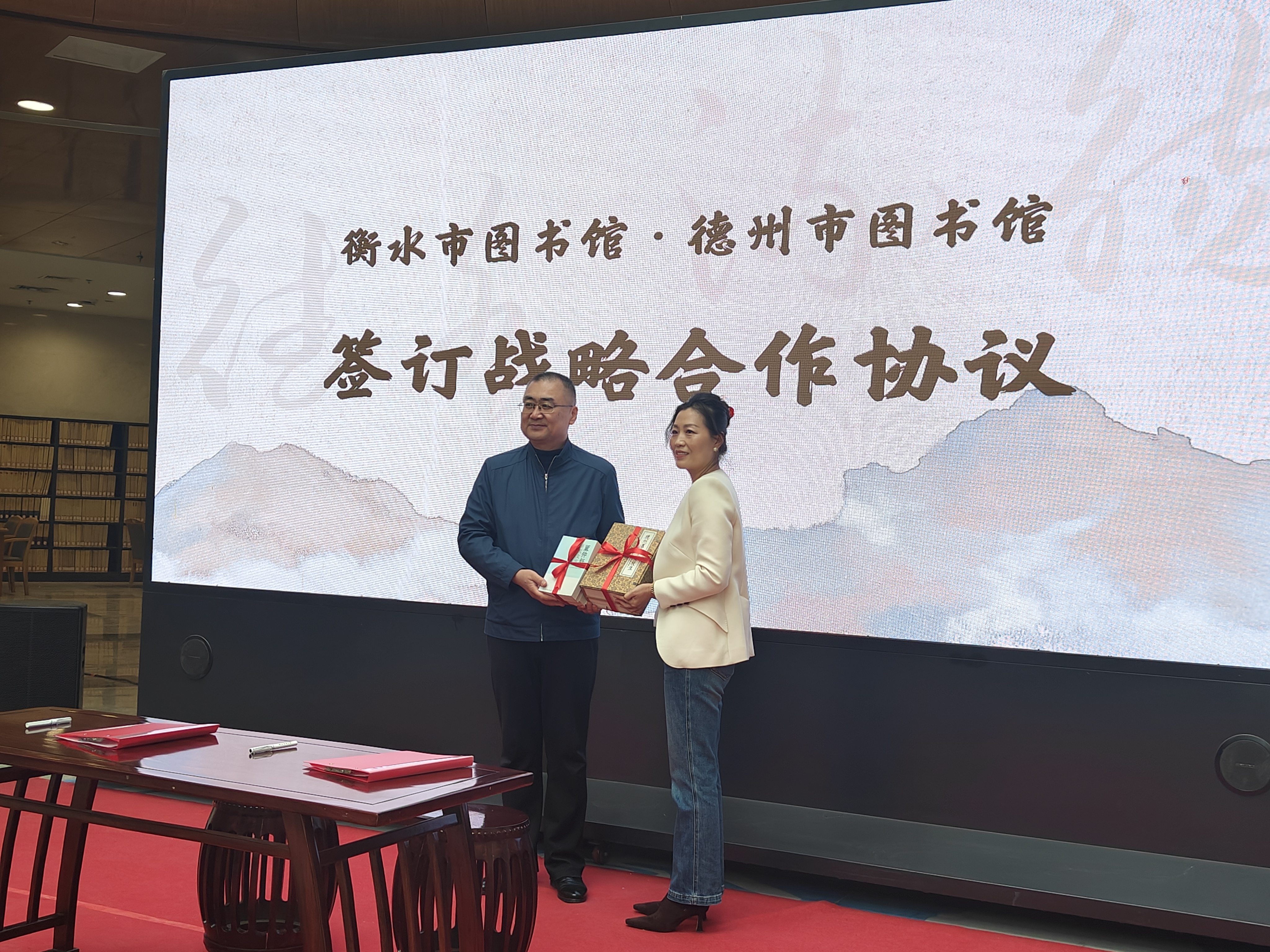 活动伊始,嘉宾集体参观了特色馆藏文献展及衡水市图书馆。开幕仪式上,衡水市文化广电和旅游局与德州市文化和旅游局领导分别致辞,强调文献作为城市记忆载体的核心价值,并高度肯定此次展览对推动地域文化交流的重要意义。随后,衡水市图书馆馆长与德州市图书馆馆长签署战略合作协议,双方约定未来将在文献资源共享、大运河文化研究等领域深化协作。当双方互换馆藏地方文献时,现场掌声如潮。这些承载着地域记忆的典籍跨越行政边界,开启了双城文化互动的新旅程。
