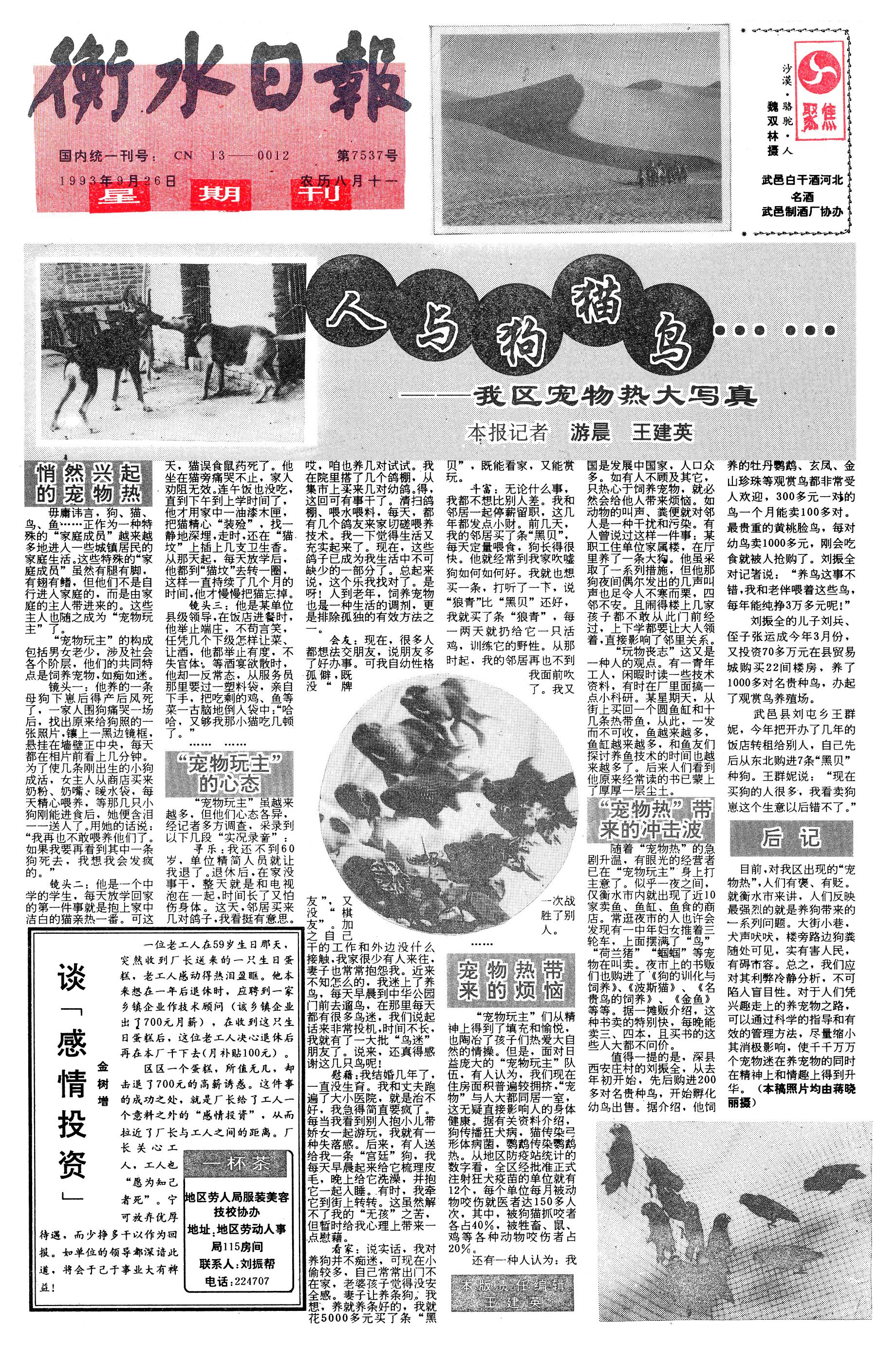 由此激发的市场效应,快速且显著——“似乎一夜之间,仅衡水市(现桃城区)内就出现了近10家卖鱼、鱼缸、鱼食的商店。”夜市里,一辆三轮车“上面摆满了鸟、荷兰猪、蝈蝈等宠物”待售。有人购进200多对名贵种鸟,孵化幼鸟出售,“每年能纯挣3万多元”;有人投资70多万元办起了观赏鸟养殖场;有的看好卖狗崽儿的生意,从东北购进7条“黑贝”种狗……(1993年9月26日《衡水日报·星期刊》)