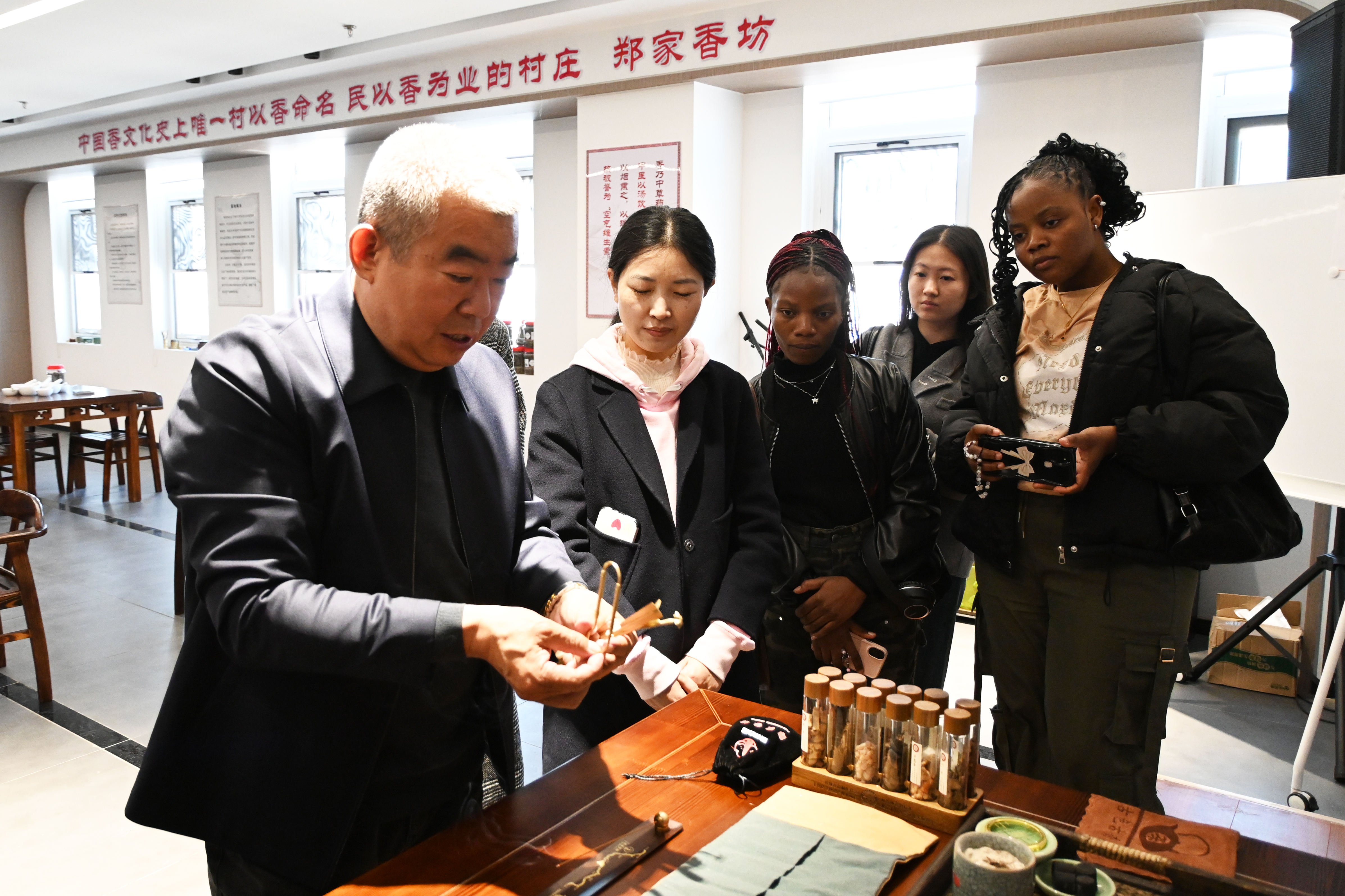活动现场,河北科技大学外国语学院的师生代表一行首先来到郑家香坊村参观共享民宿建设工地,并在郑家香坊非遗大讲堂深度体验传统制香技艺。双方现场签署实践基地协议,举行挂牌仪式,在非遗传承、文化研究、人才培养等领域达成战略合作。