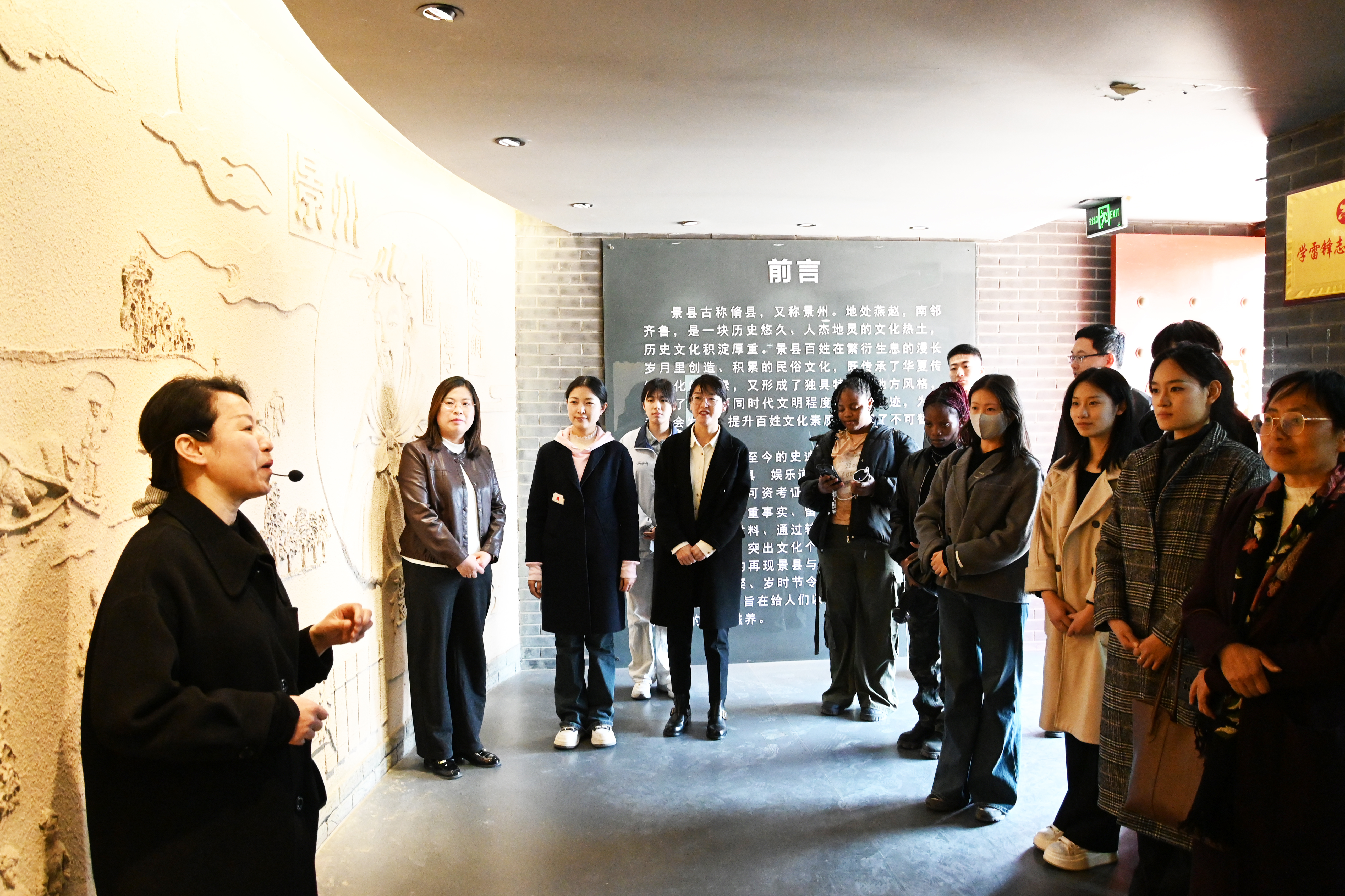 签约挂牌仪式结束后,师生团队在景州民俗馆开展了沉浸式研学,从精美的传统手工艺品到古朴的生活器具,每一件展品都承载着景县人民的智慧和情感。在参观过程中,师生们不时驻足观看,与讲解员交流互动,通过实物考察与互动讲解,不仅加深了对景县民俗文化的直观认知,更切身感受到非物质文化遗产保护与传承的时代重任。随后,师生团队一行来到景县中学进行沟通交流。
