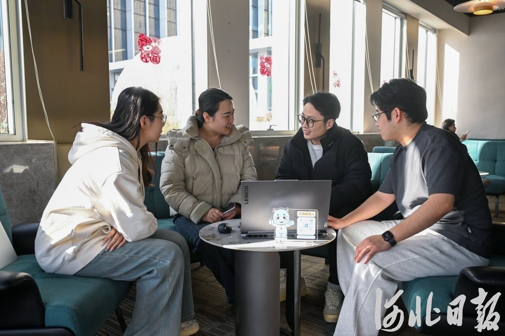 2月24日,雄安新区中关村科技园B2栋2楼咖啡厅,两家科技公司工作人员在商讨合作项目。河北日报记者 田明摄