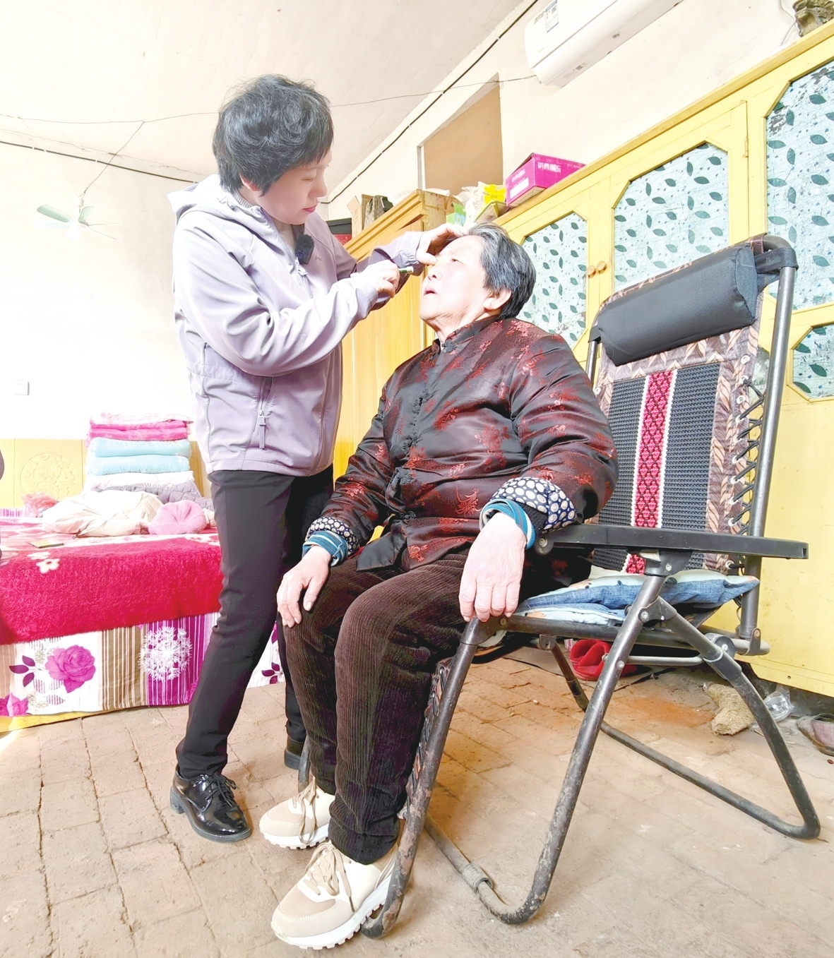 走进屋里,郑大俊的两位老朋友正在聊天。郑大俊满脸骄傲,拉着于俊义介绍:“这是四院的大专家,就是她把俺眼睛治好的!”说完,郑大俊热情地让于俊义坐到床上,拉着她的手说:“你今天来,俺高兴得不得了!”俩人唠着家常,于俊义拿出眼部检查仪器,仔细地给郑大俊做检查。郑大俊的朋友一听是衡水四院专家,也赶紧凑过来,请于俊义给自己检查眼睛。