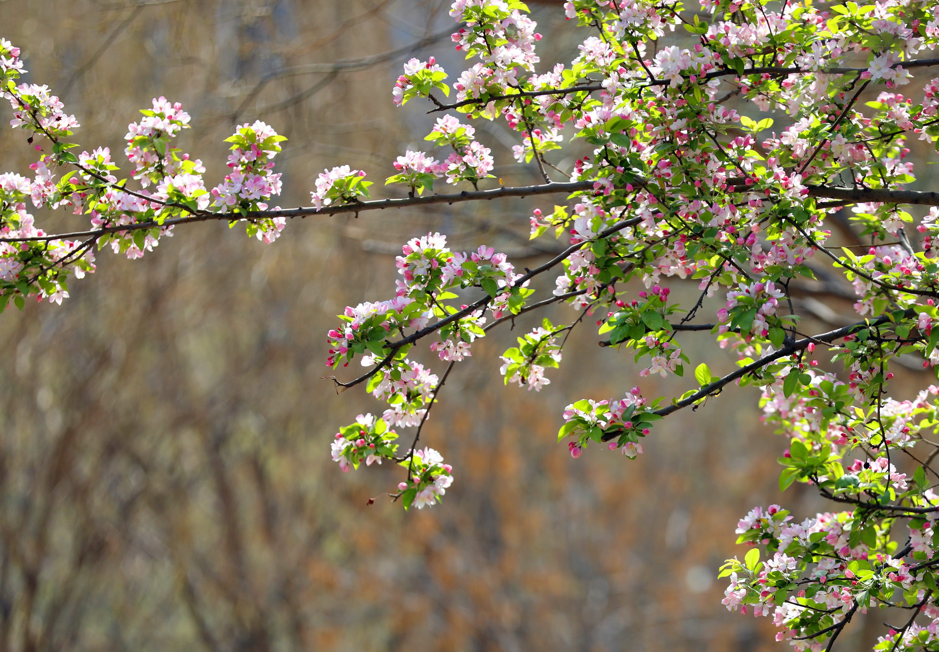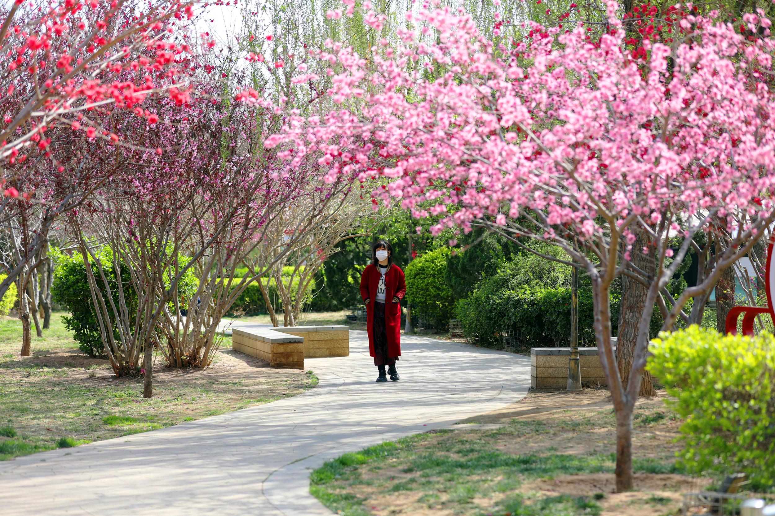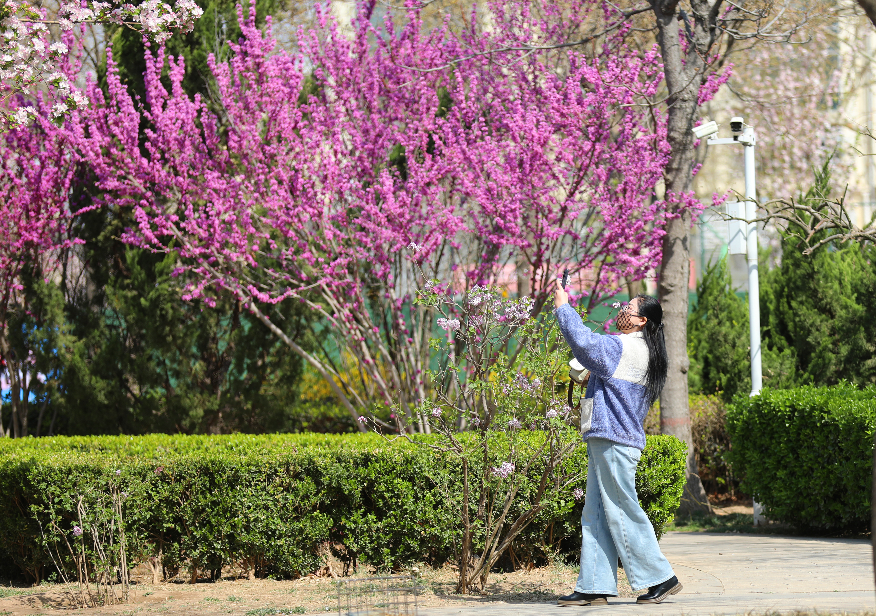 除了紫荆、碧桃和西府海棠,丁香、木槿、紫叶李等各色春花也不甘示弱,同样争奇斗艳、竞相绽放。它们各自展现着独特的风姿,红的像火,粉的像霞,白的像雪,五彩斑斓的花朵交织在一起,构成了一幅绚丽多彩的春日画卷。