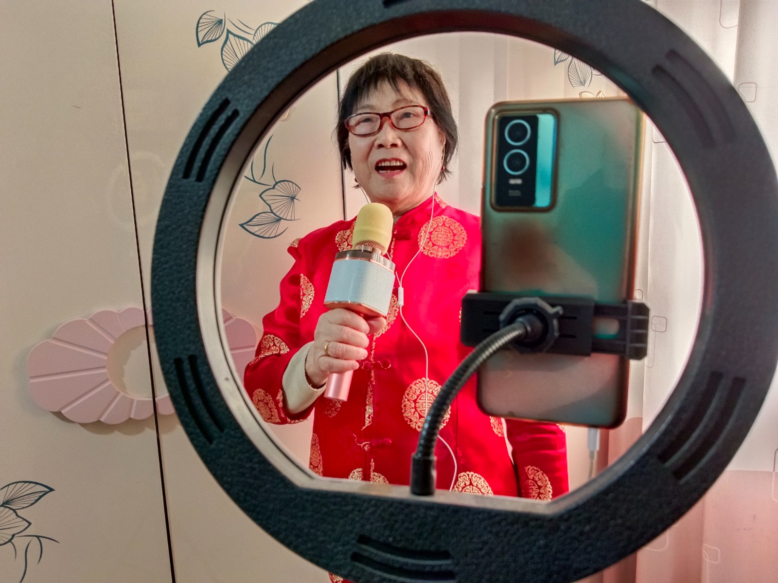 近日,鲍凤英在线上演唱歌曲。 李柔嘉 摄