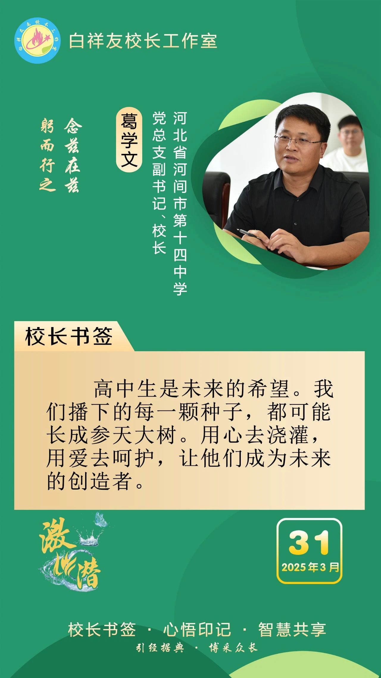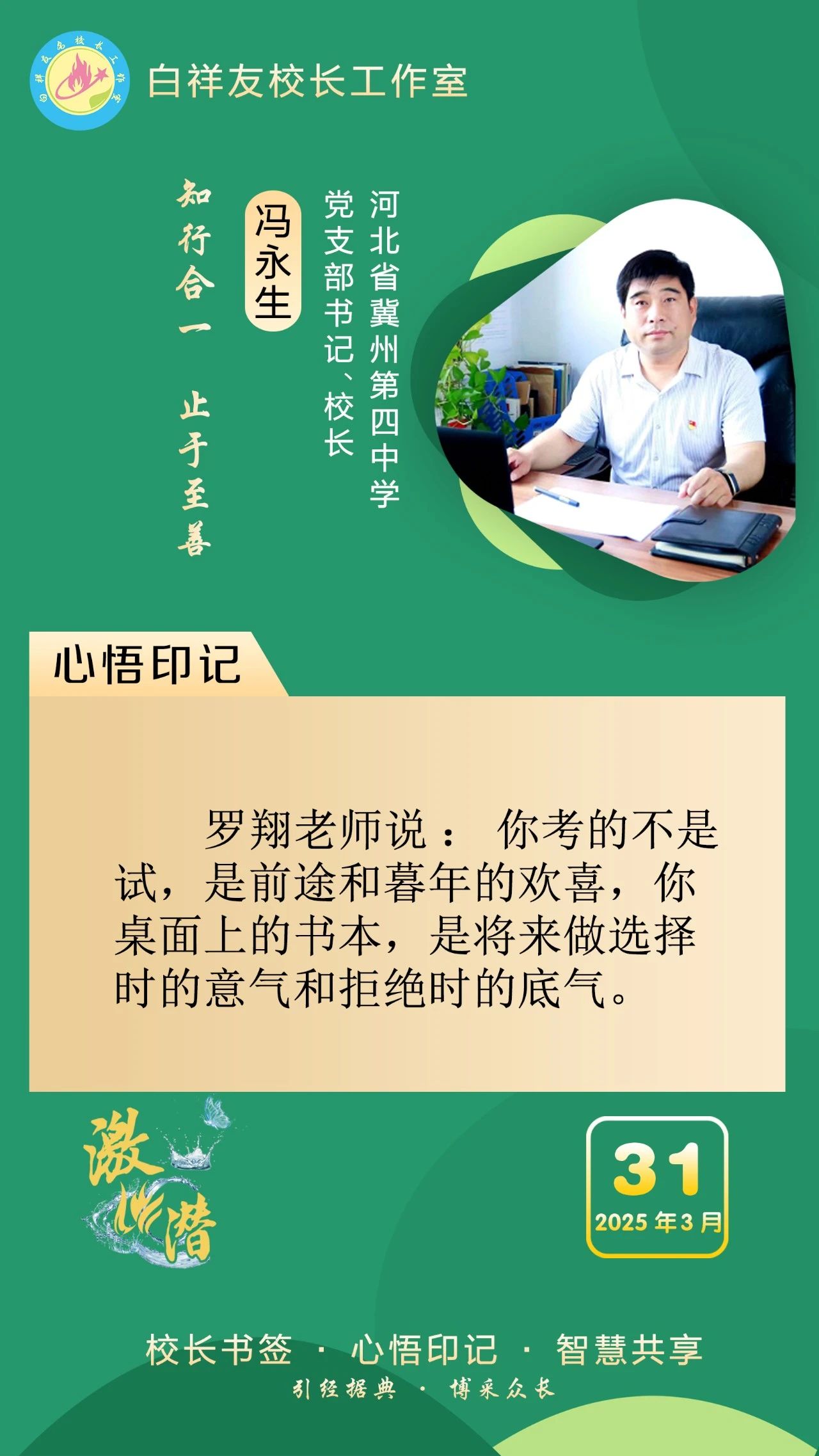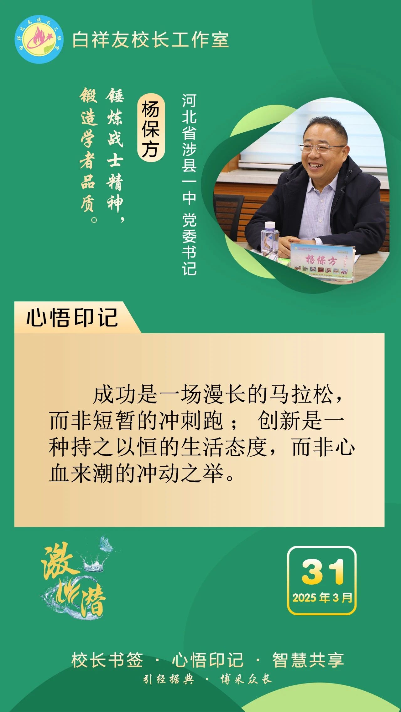 “白祥友校长工作室”成立于2019年4月,是教育部“国培计划”中小学名校长领航工程、河北省首批名校长工作室,目前省内外成员校56个。工作室坚持“资源共享、智慧共融、互助共赢”理念,已成为思想碰撞的交流场,资源共享的品牌站,成果展示的辐射源。