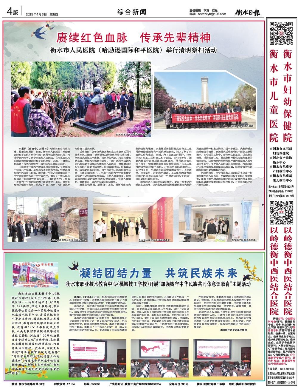 为缅怀革命先辈朱琏、传承红色基因,日前,衡水市人民医院(哈励逊国际和平医院)联合中国中医科学院针灸研究所、河北中医药大学、南宁市第七人民医院,在河北省双凤山陵园和哈励逊国际和平医院原址,开展了“赓续红色血脉·传承先辈精神”清明祭扫主题党日活动。