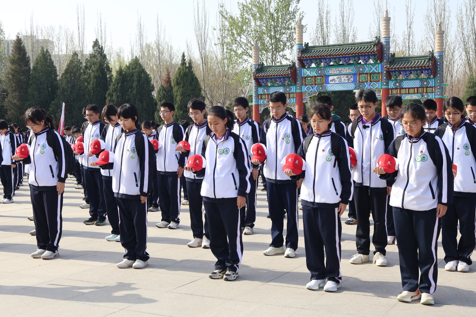 8时30分,队伍顺利抵达衡水市烈士陵园。庄严的国歌声奏响,清明祭奠英烈仪式开始。学生们以班级为单位统一列队,肃穆而立,全场默哀一分钟。微风轻拂,松柏低语,衡中国旗班的同学将寄托着崇高敬意的花篮轻轻摆放于碑前,表达对革命先烈的无限追思。“我志愿加入中国共产主义青年团,坚决拥护中国共产党的领导……”全体团员重温了入团誓词,誓言铮铮,回荡在天地间。