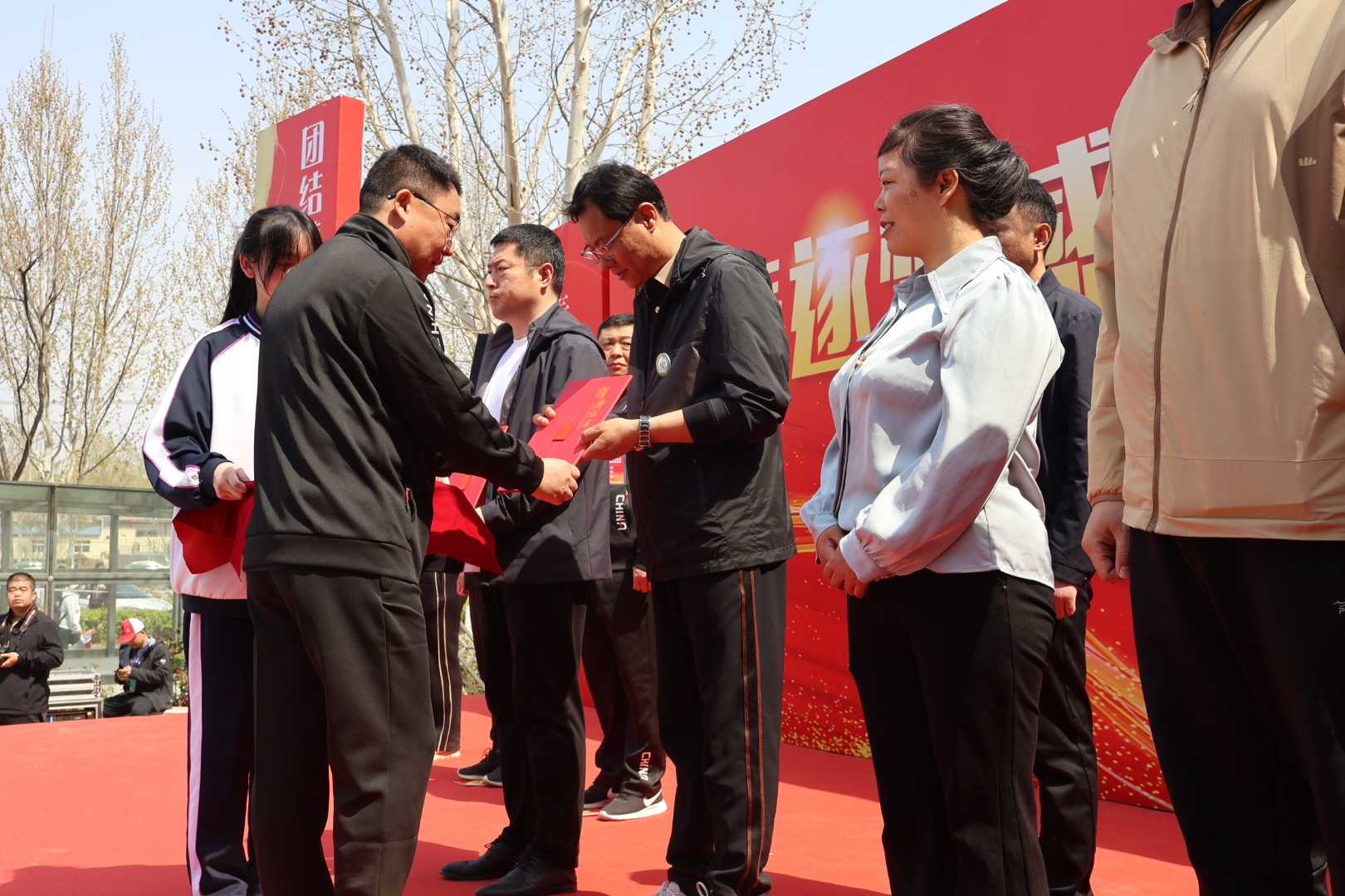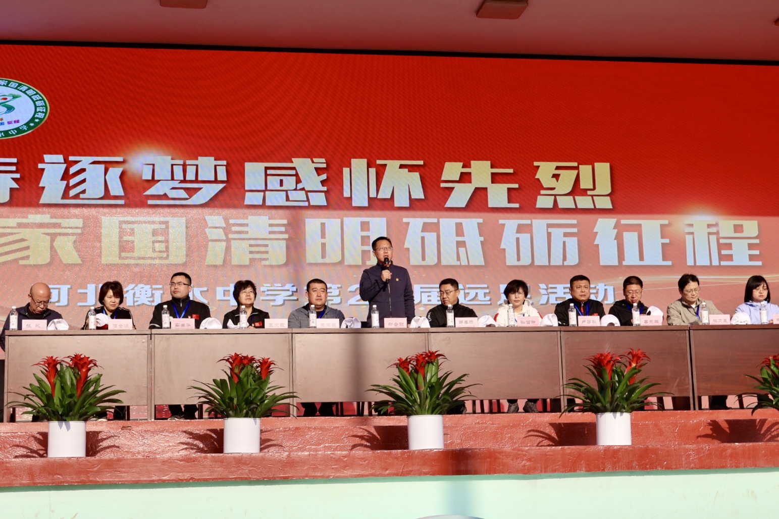 11时30分,经过4个小时的跋涉,全体师生顺利到达宿营地。衡水中学党委副书记、校长郭春雨颁发捐赠证书,家长代表进行发言,学生代表宣读倡议书,全场齐唱《我和我的祖国》,为伟大祖国送上最美好的祝福。随后,他们举行了丰富多彩的文艺演出。一首首奋发向上的歌曲,赢得了在场人员的阵阵掌声。