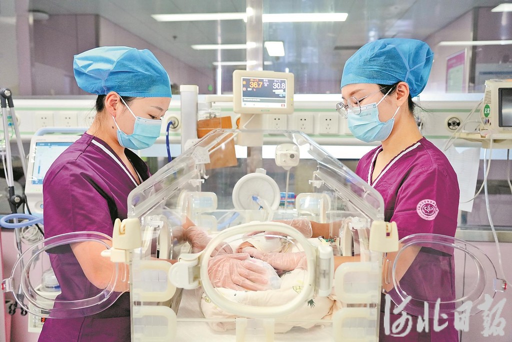 北京儿童医院保定医院新生儿科医生王贤(右)在为患儿检查身体。(河北日报资料片)