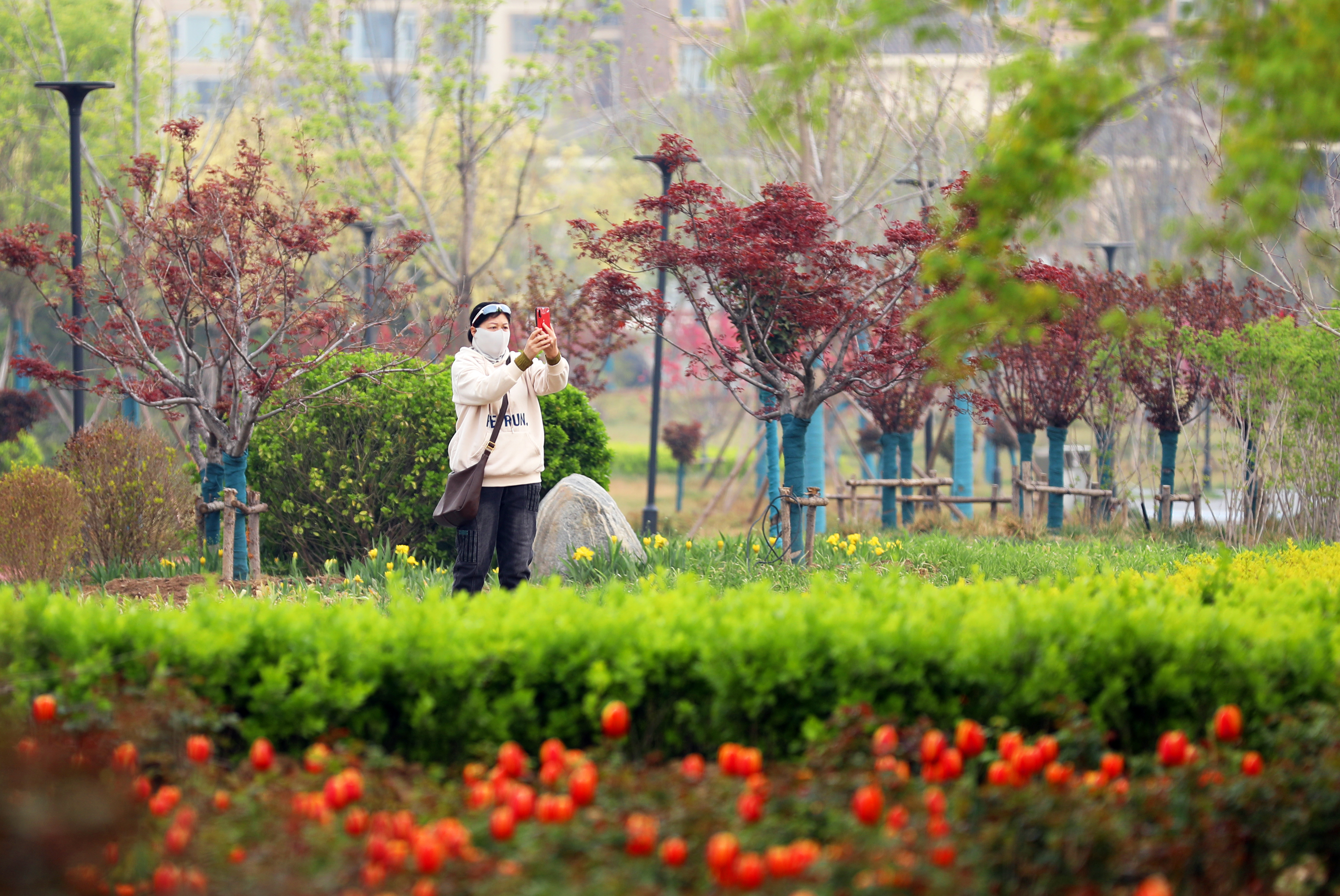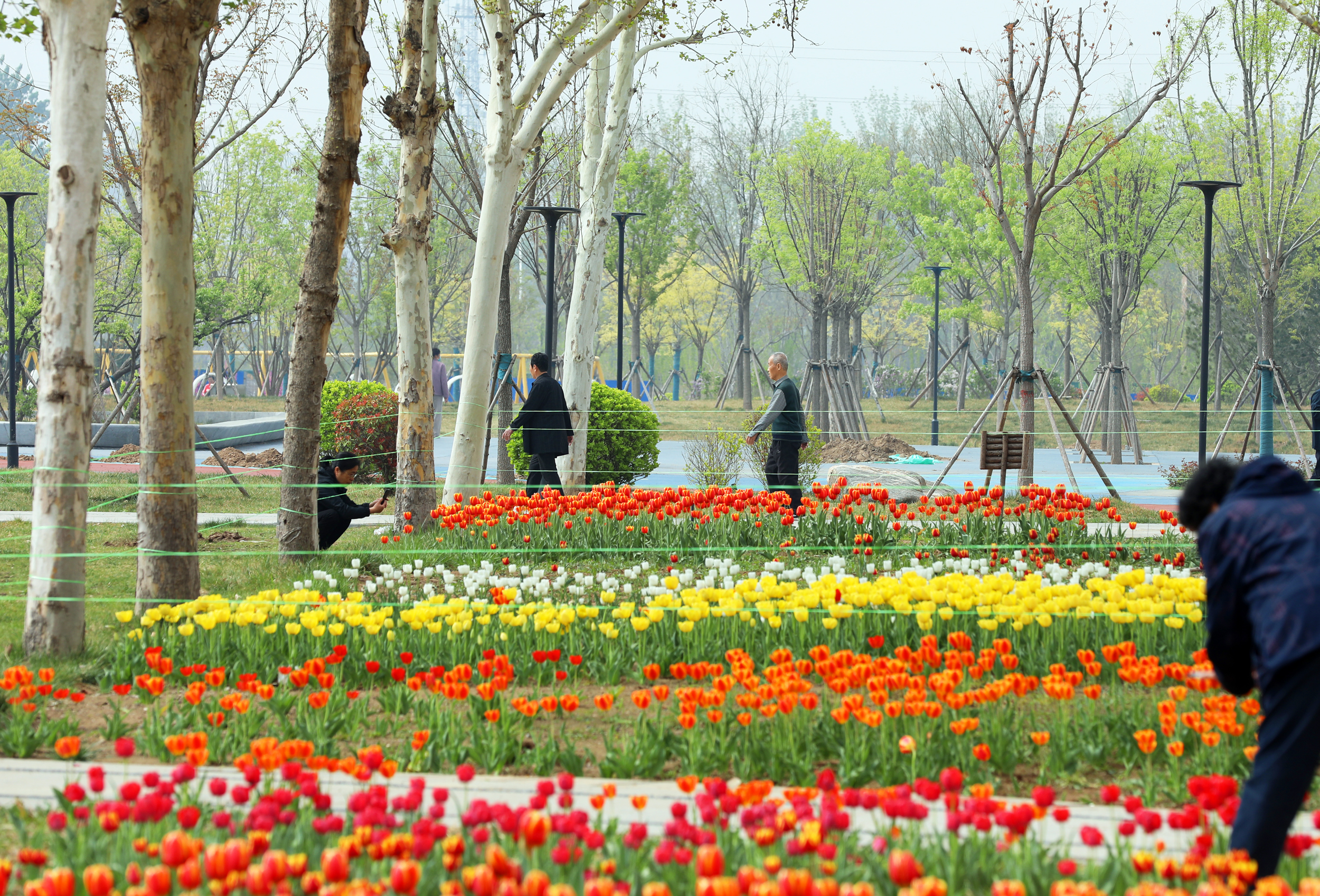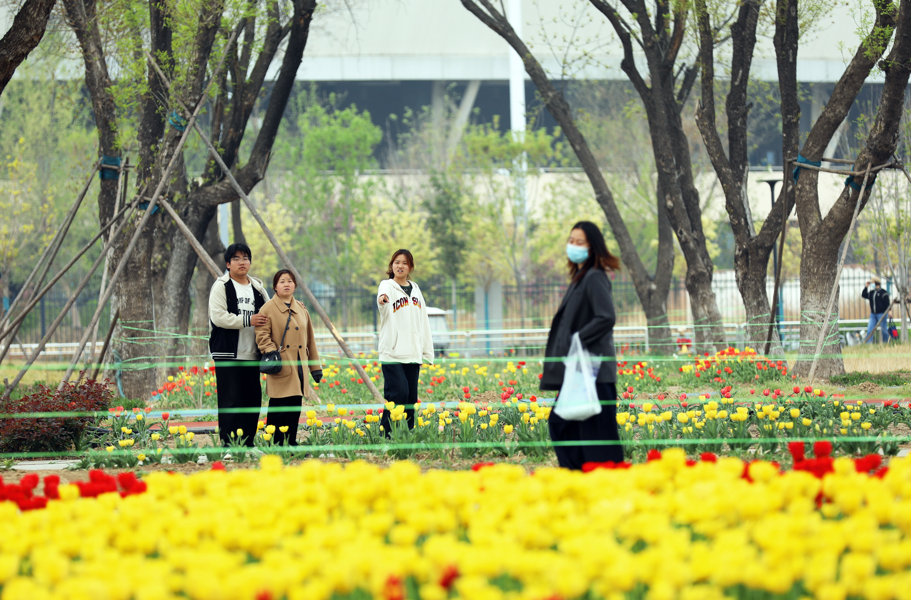 近日,随着气温逐渐回暖,市区奥体公园内生机盎然。园内大片盛开的郁金香格外引人注目,品种多样、色彩缤纷,吸引了众多市民前来观赏打卡。