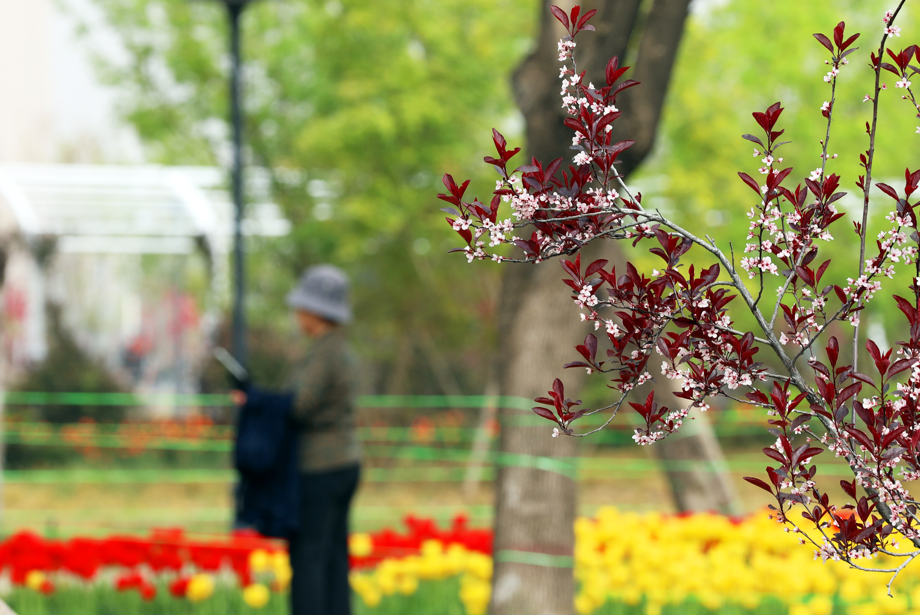 除了主角郁金香外,桃花、海棠等各色春花也在园内竞相绽放。粉白相间、繁花满枝的它们,与郁金香相互映衬,共同绘就了一幅春意盎然的美丽图景。微风拂过,花朵轻轻摇曳,浓郁的花香扑鼻而来,让人心旷神怡。