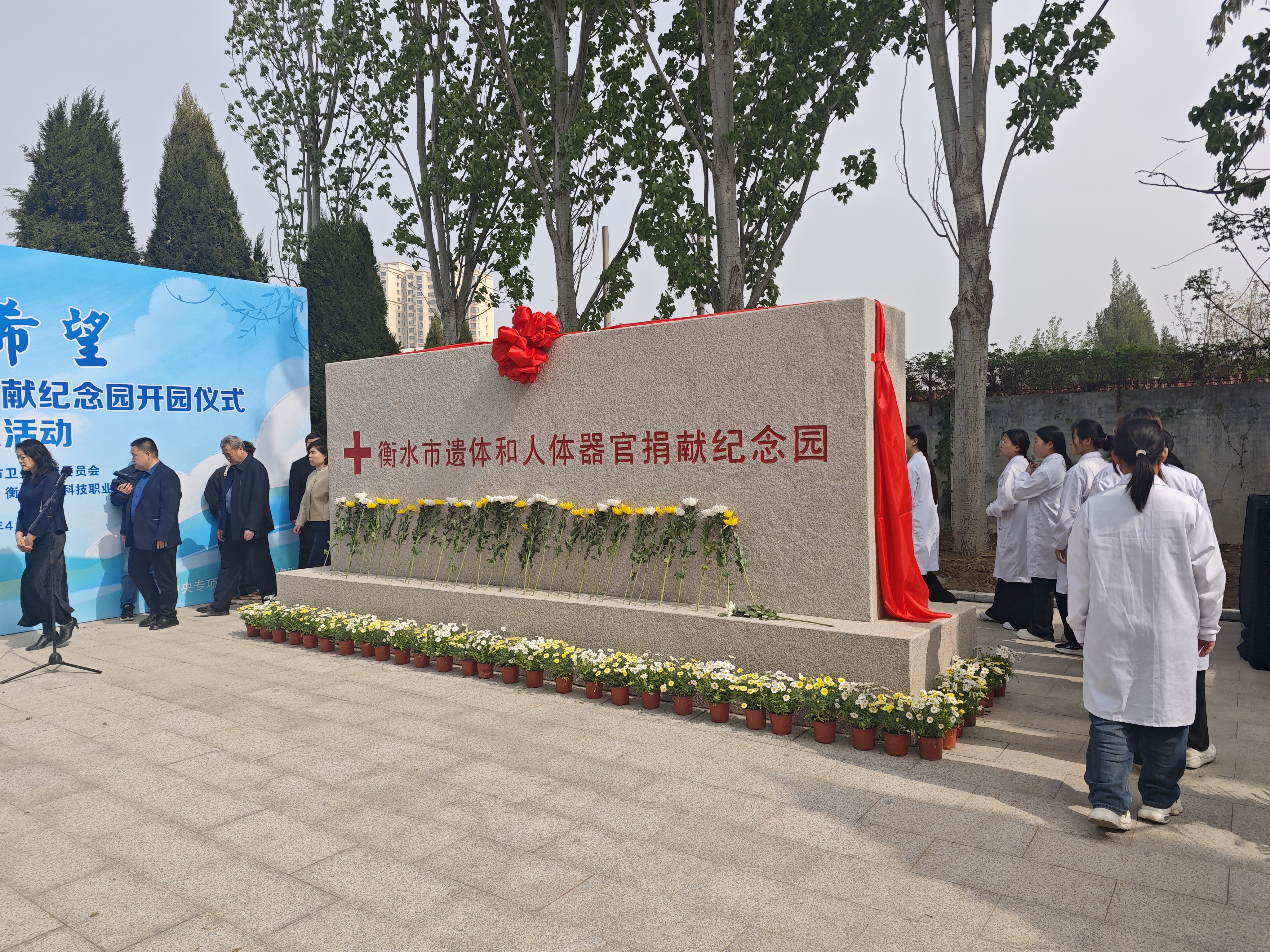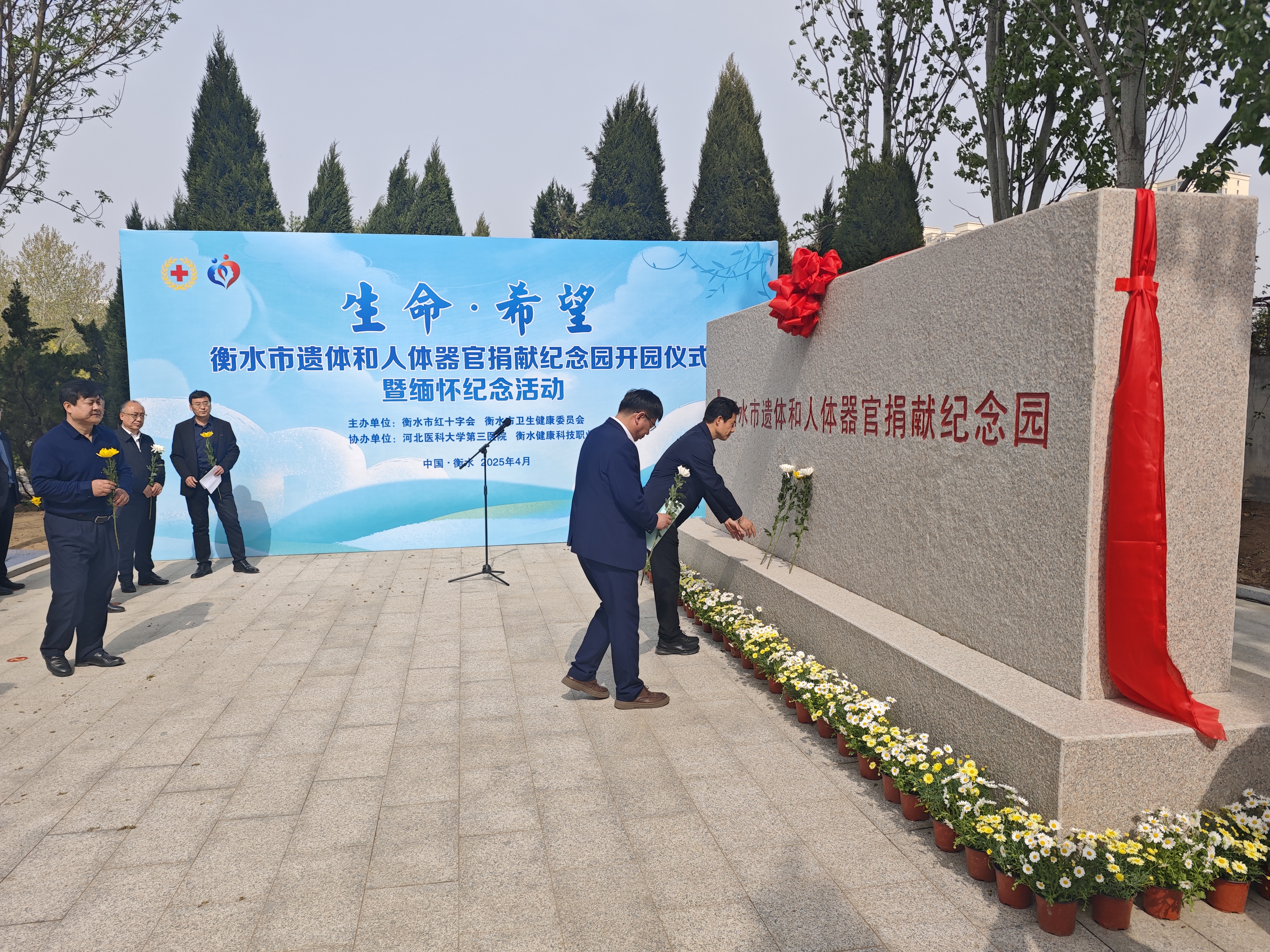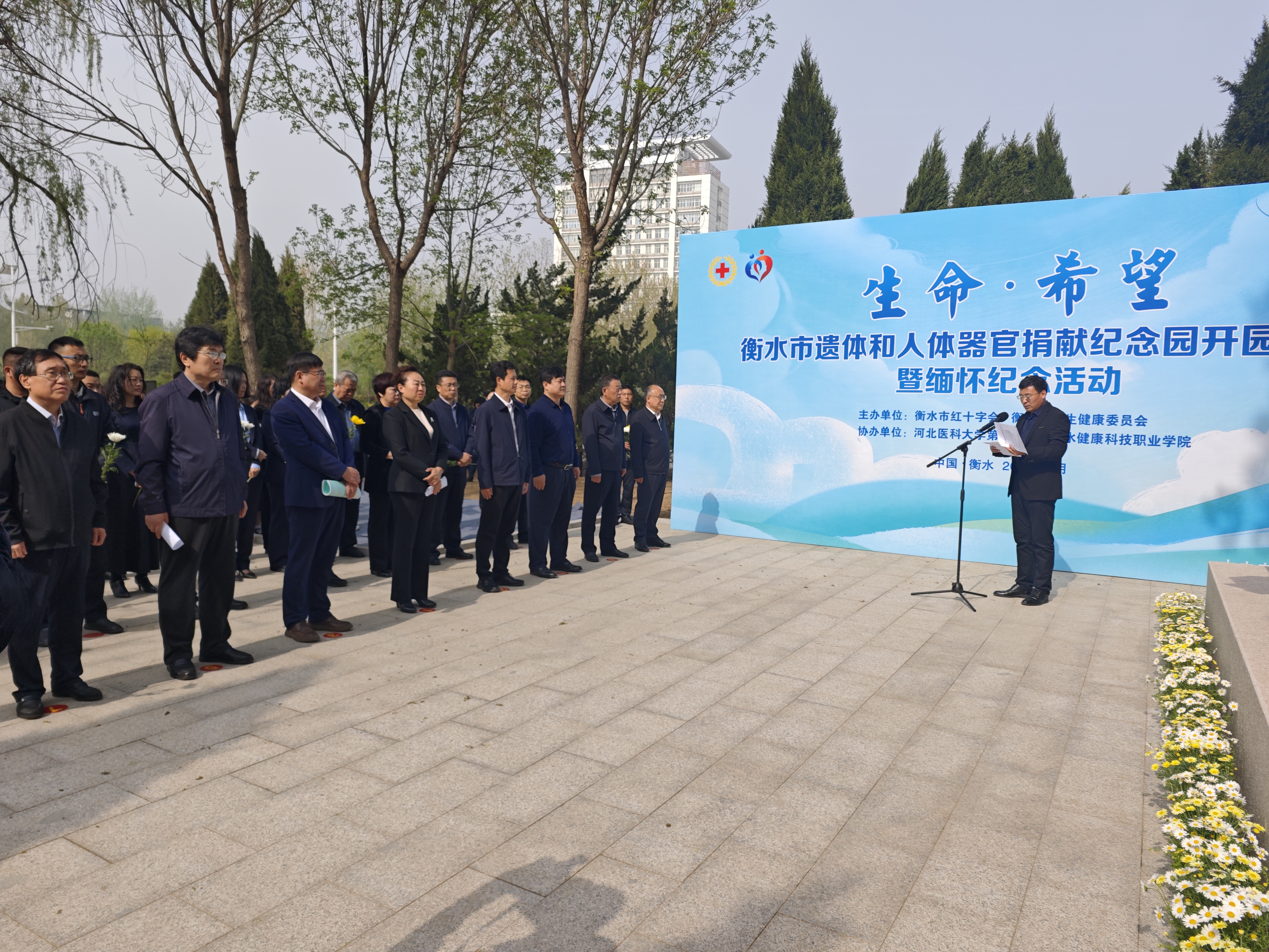 4月11日上午,衡水市遗体和人体器官捐献纪念园开园仪式暨缅怀纪念活动在衡水健康科技职业学院举行。衡水市红十字会联合衡水市卫生健康委员会主办此次活动,市政府、省红十字会、省医大三院相关领导、医务人员代表、医学生代表等150余人共同参与,向无私捐献者致以崇高敬意。