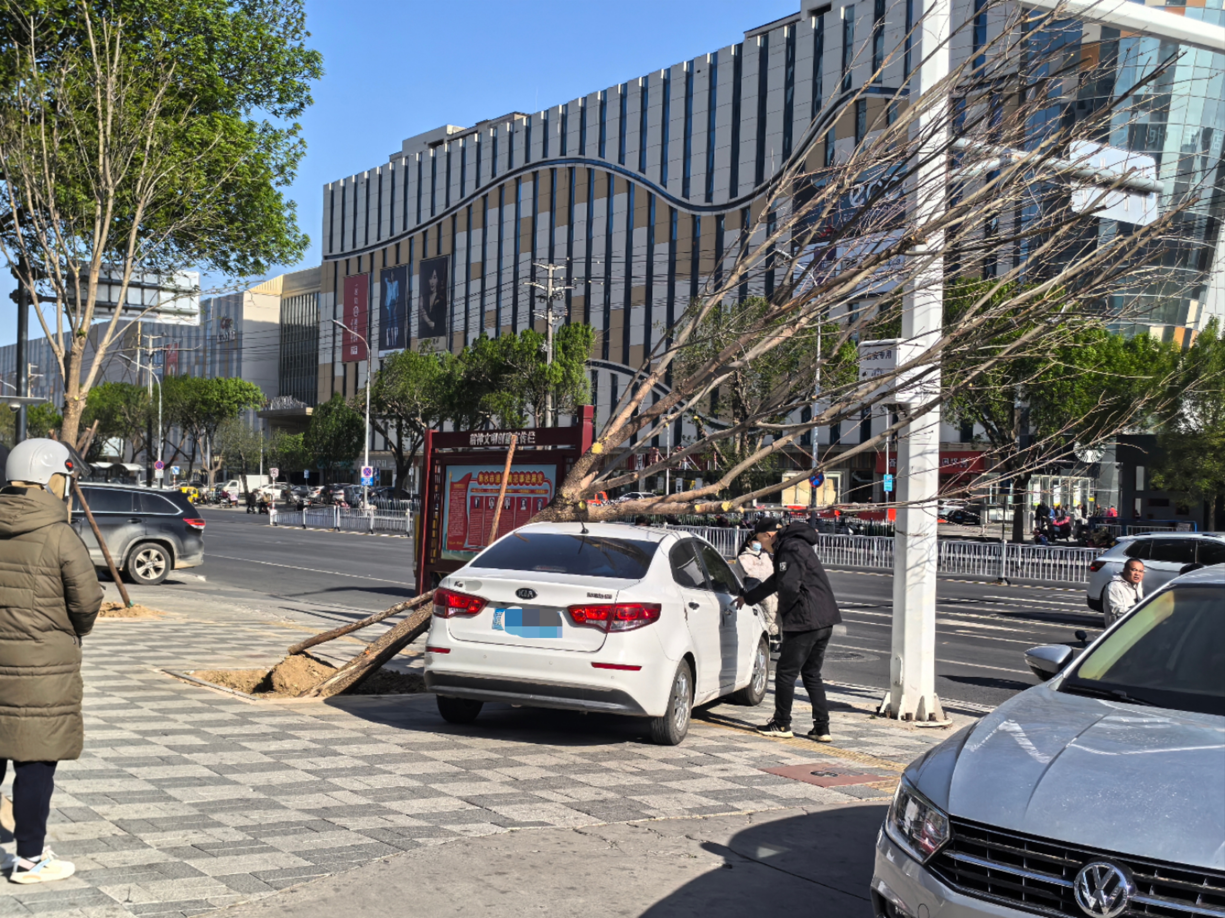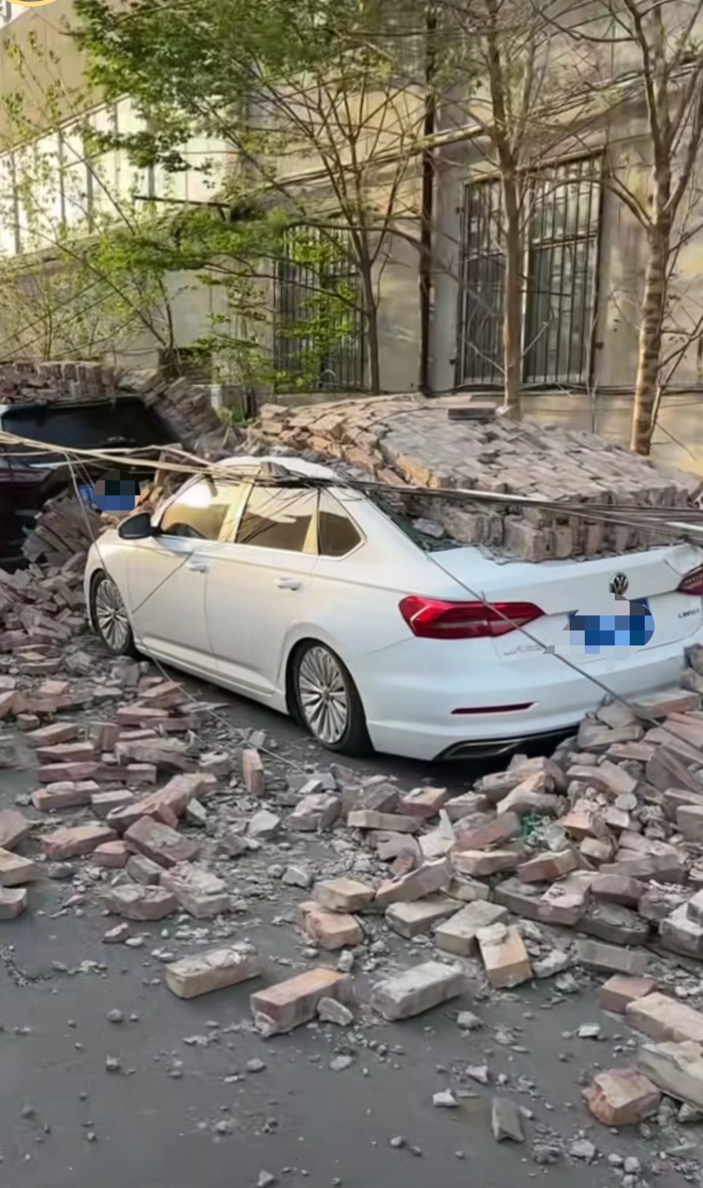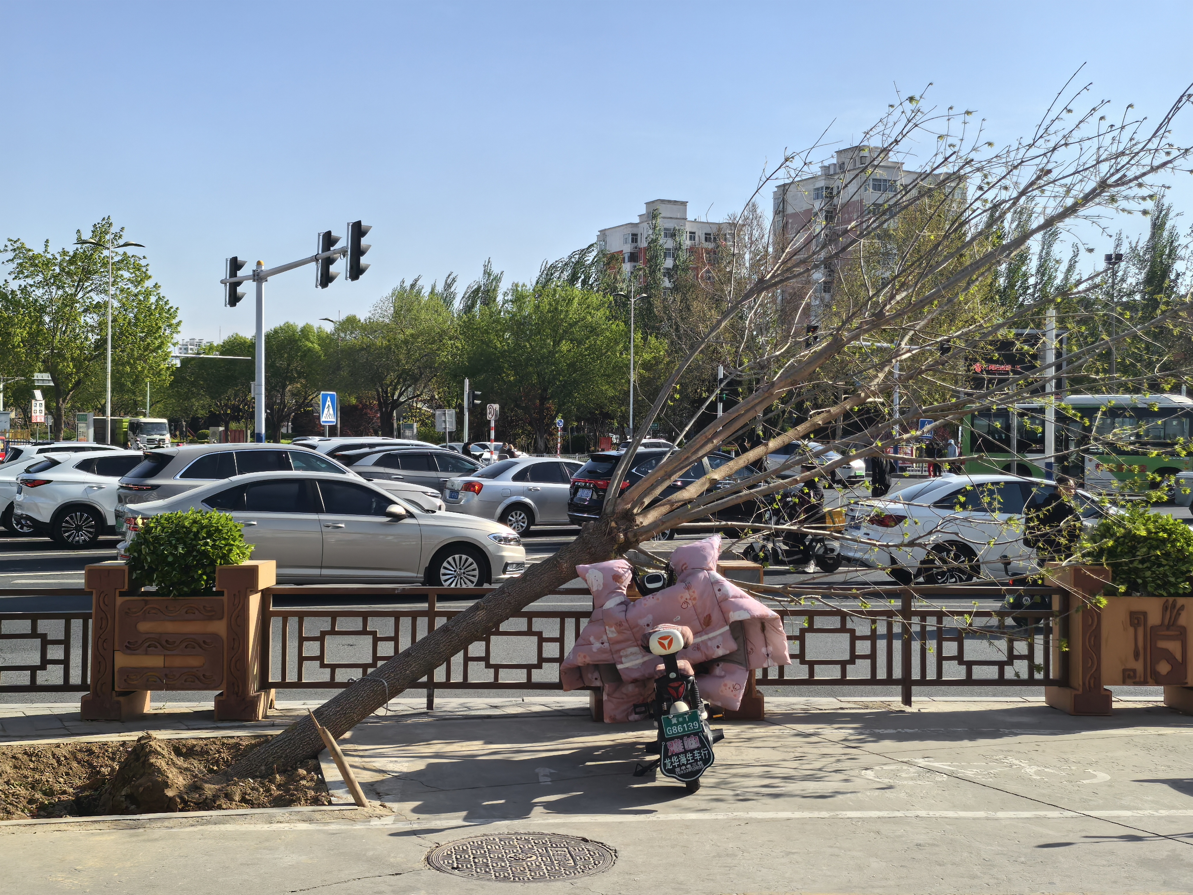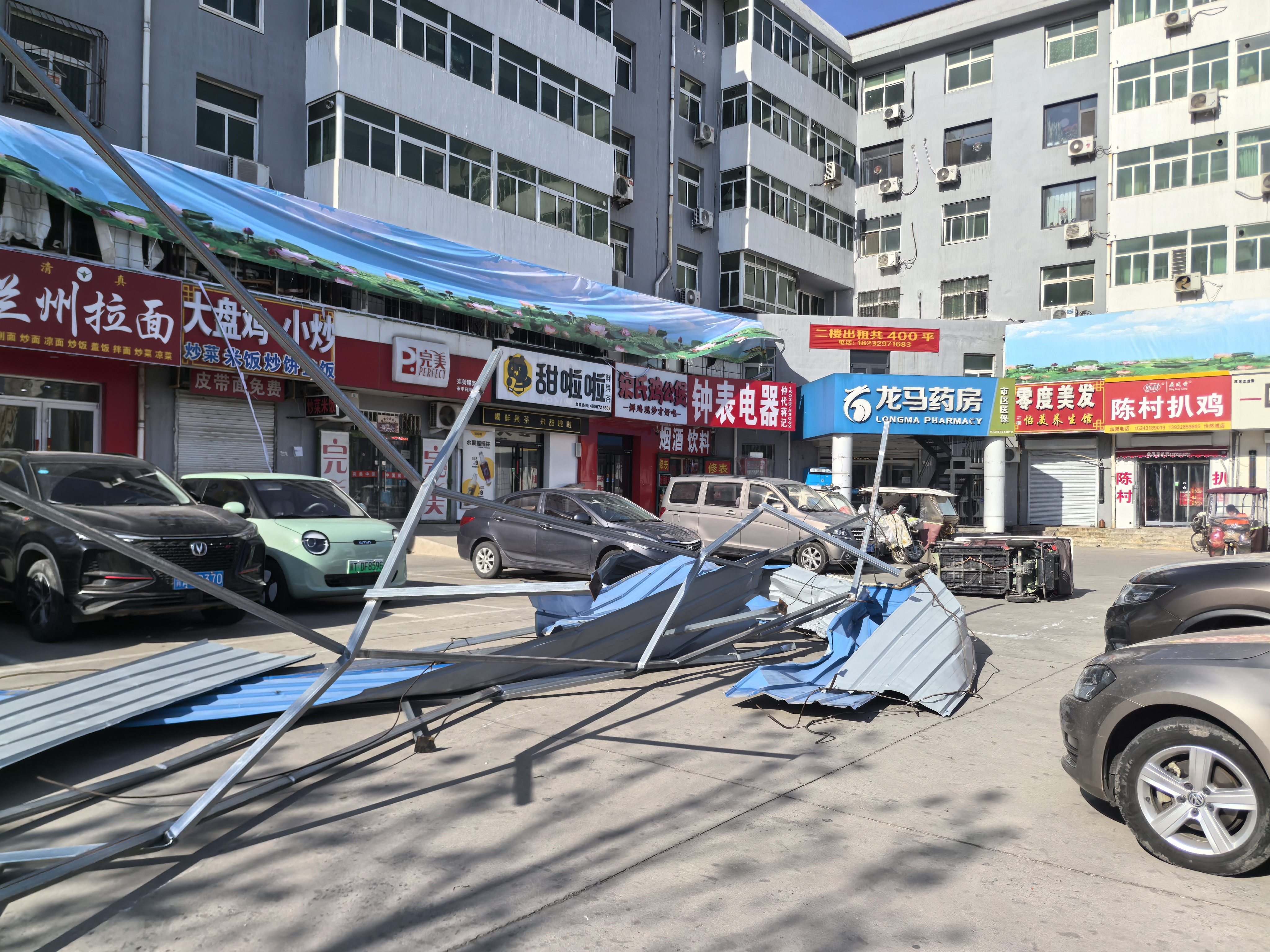 此次极端大风天气就极具破坏性。在市区大庆路与榕花街交叉口西南角,铁皮围挡被吹跑,铁支架都变了形;两棵道旁树被吹倒,砸到了旁边的车上。还有的地方年久的砖墙不堪大风侵袭倒下一片,旁边的汽车都遭了殃。
