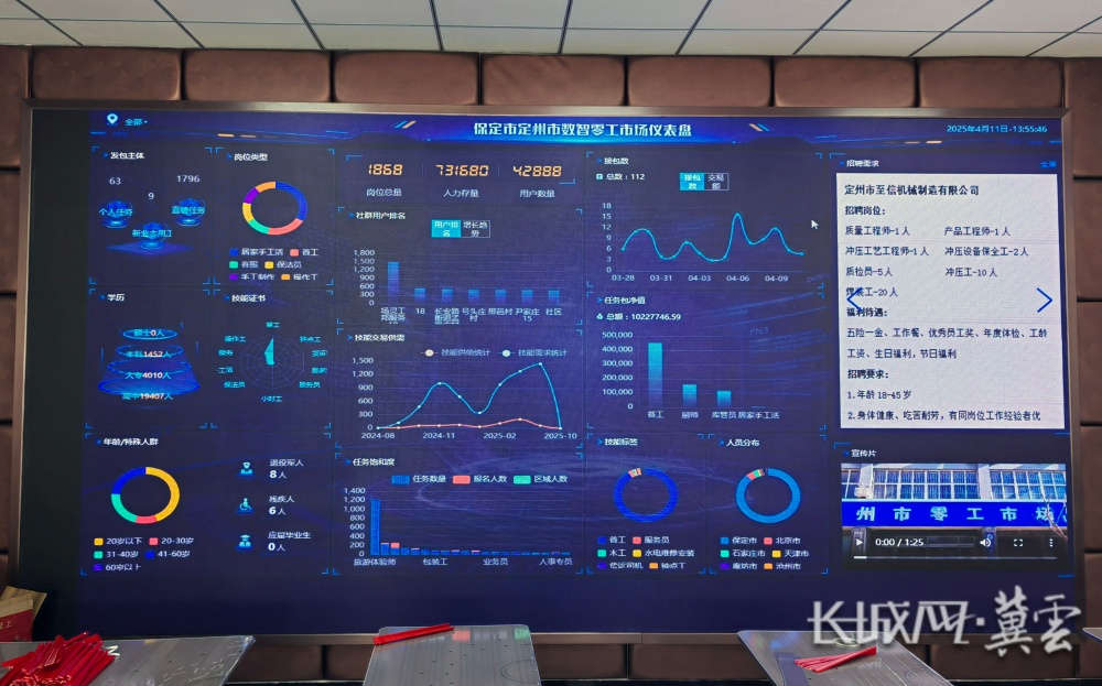 走进定州市零工市场,电子屏上招聘需求、技能交易供需、人员分布等数据清晰呈现,求职者与用工企业在此高效对接。