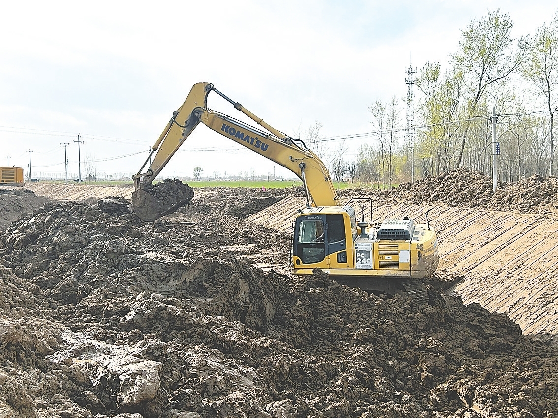 挖掘机在河道进行清淤工作。 孔令佳 摄