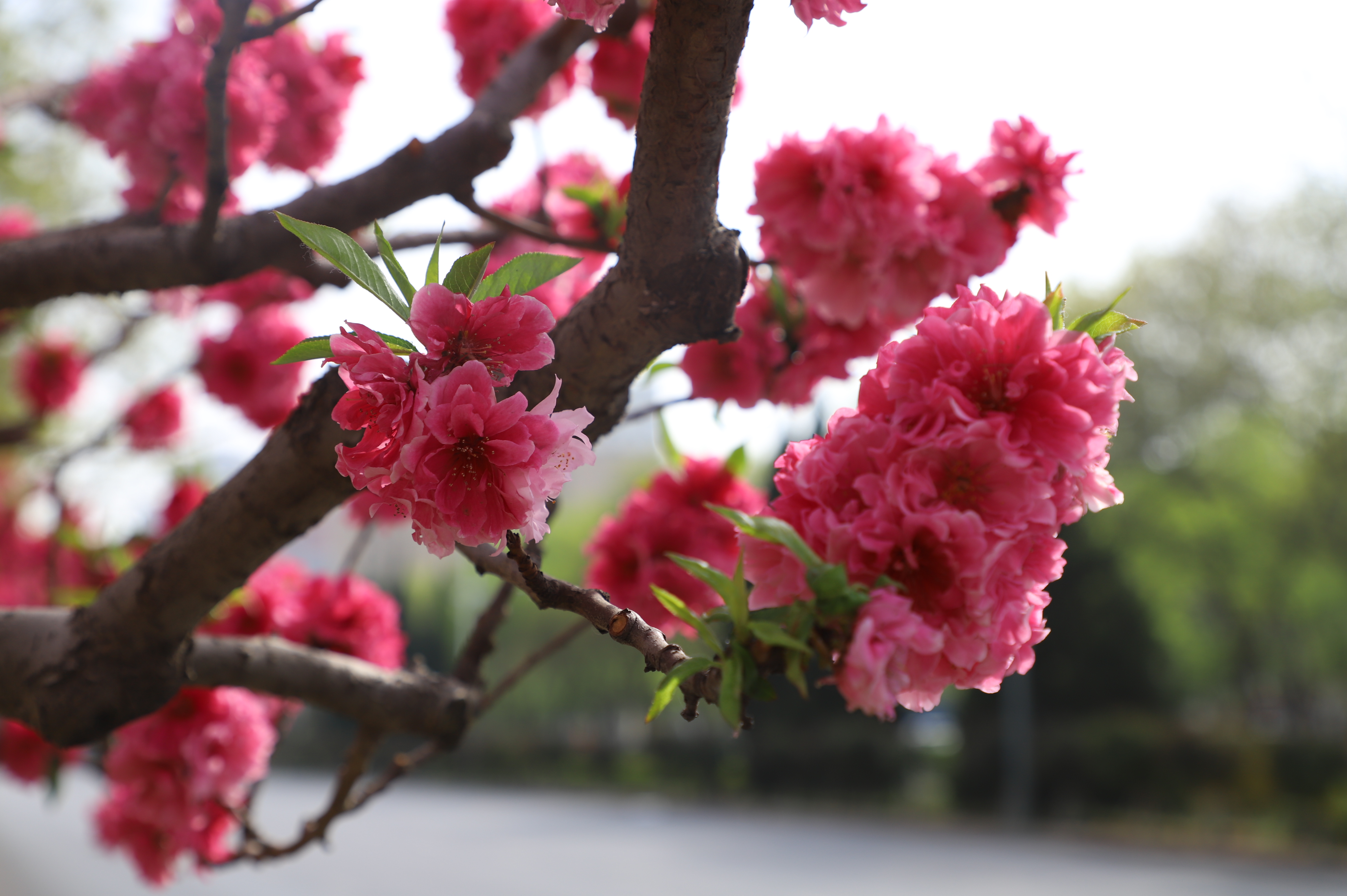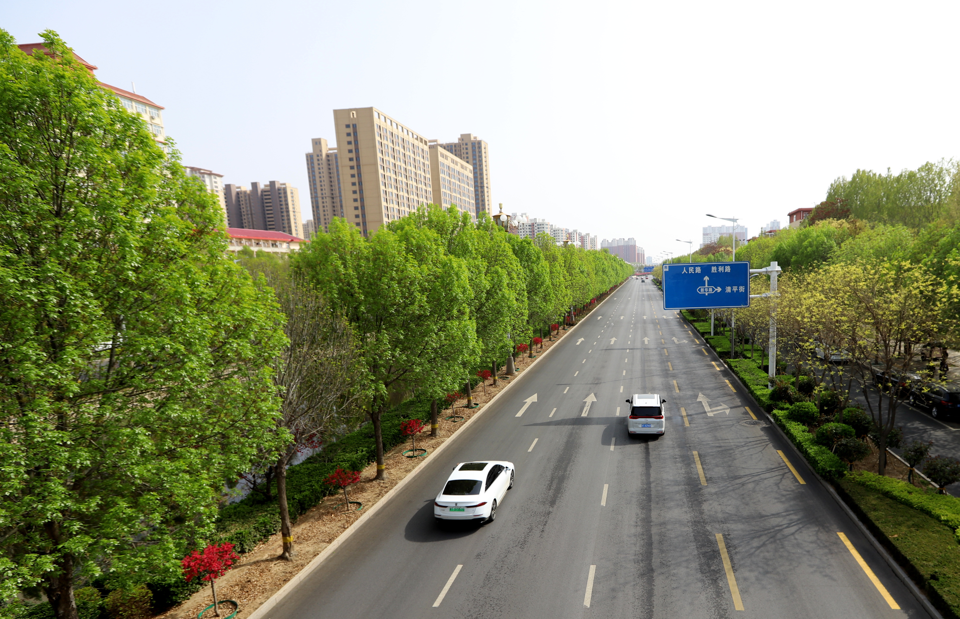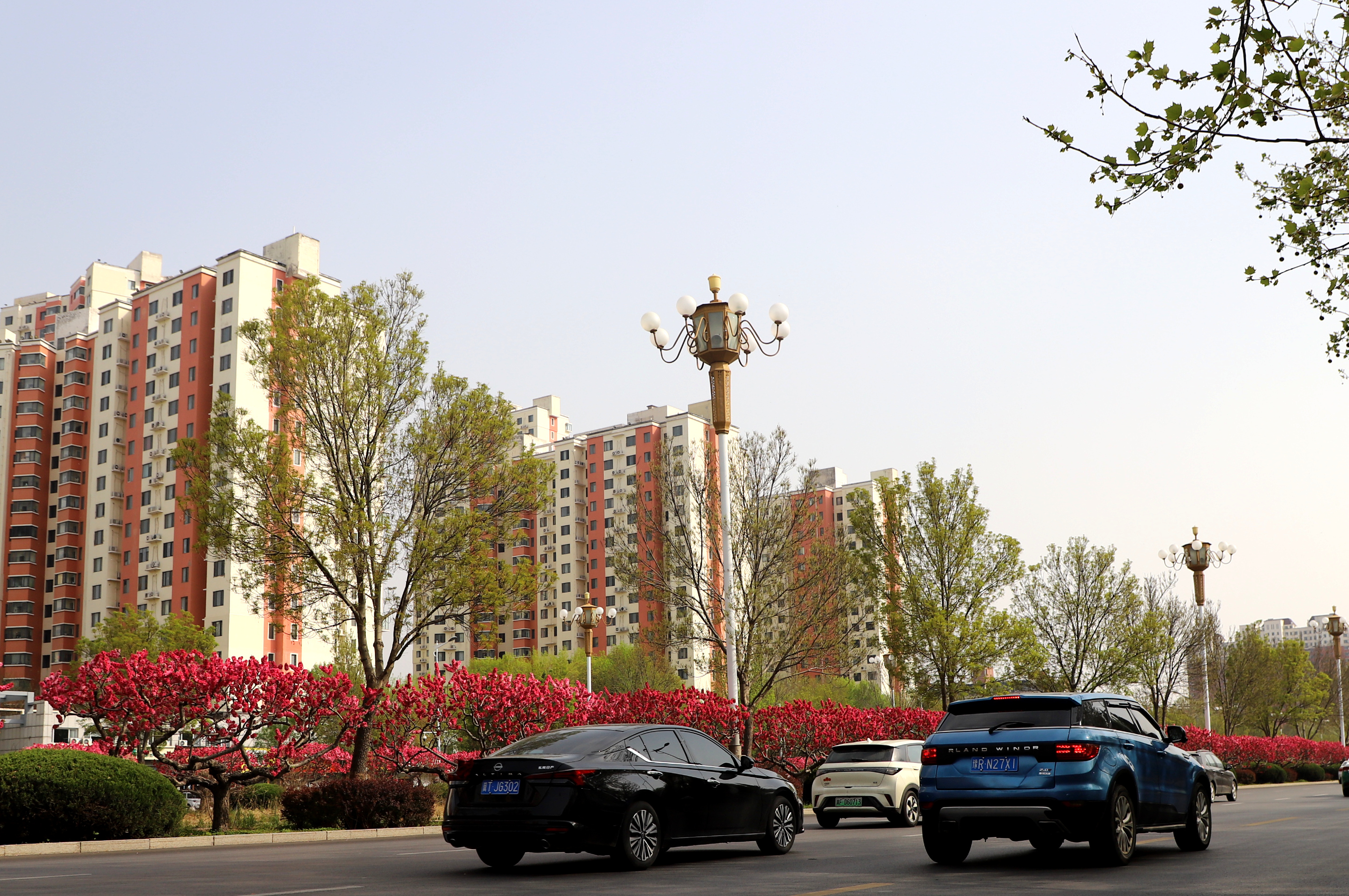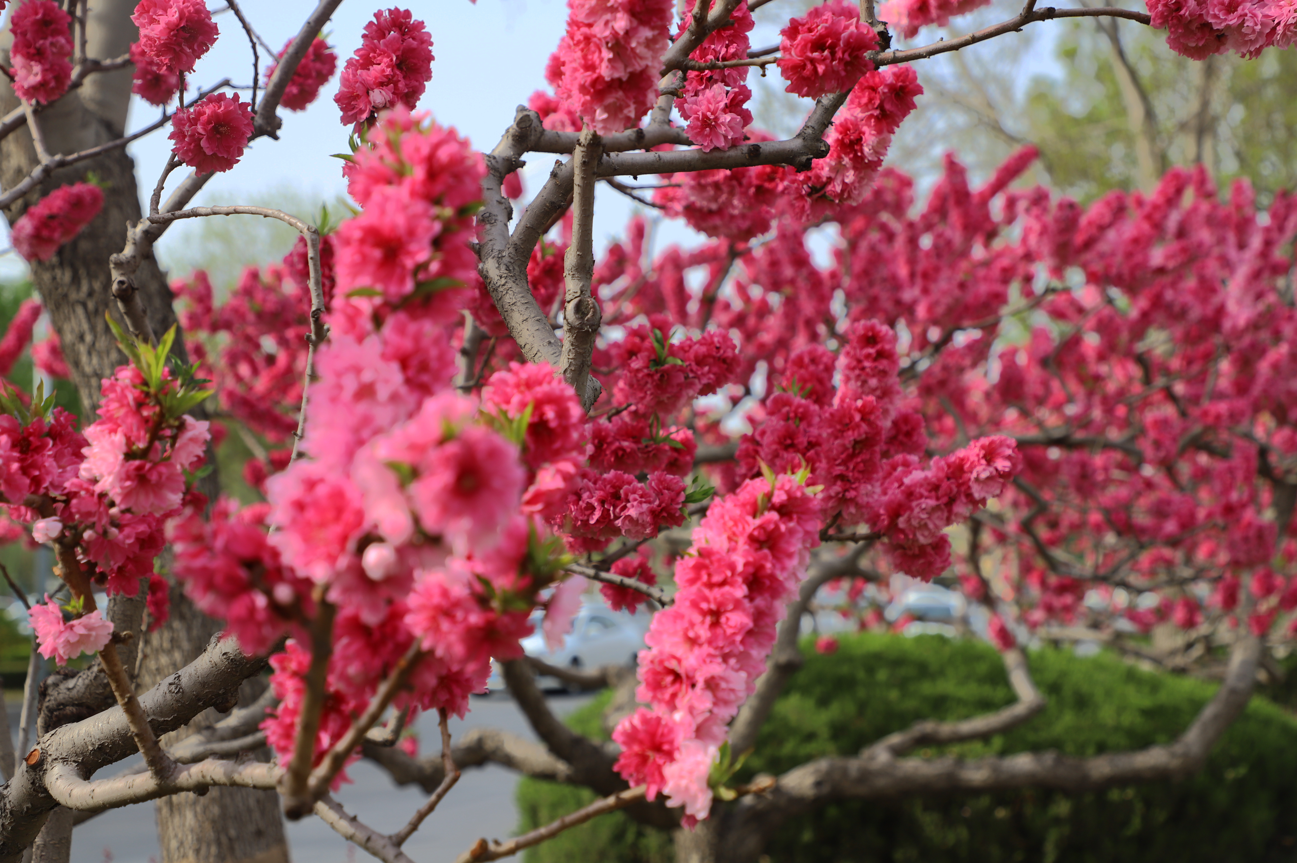 在市区的前进街,春日的美景宛如一幅绚丽画卷。街道两旁绿树枝叶在微风中轻轻摇曳,碧桃花恰到好处地点缀其中,为这抹绿色增添了几分俏皮与艳丽。前进街两旁的建筑在这花与树的烘托下,更显独特韵味,让人不禁沉醉在这充满生机与烟火气的春日街景之中。
