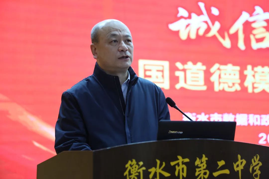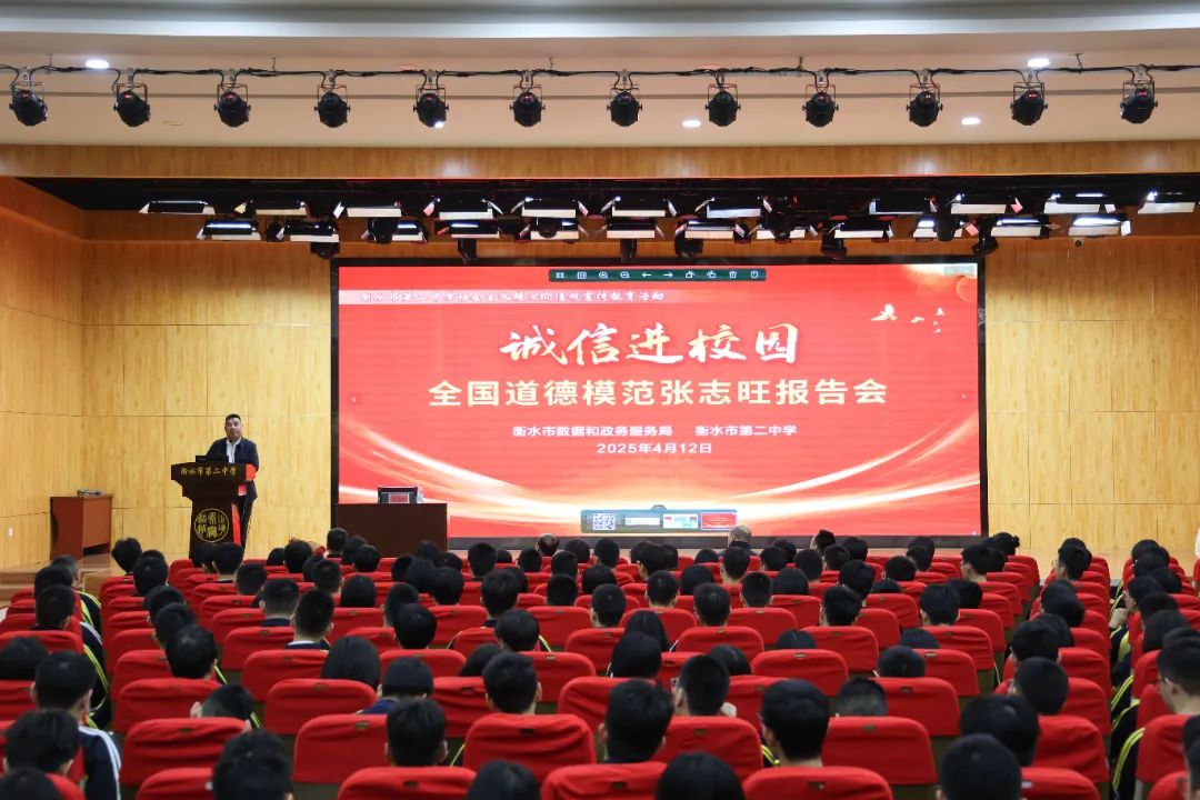 为弘扬诚信精神,营造诚实守信的校园氛围,引导青少年树立诚信理念,4月12日,衡水市第二中学联合衡水市数据和政务服务局共同举办“诚信进校园”主题活动,邀请全国道德模范张志旺同志进校开展专题报告会。