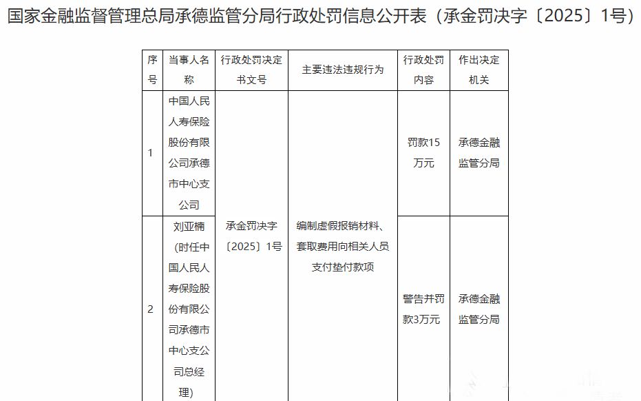 近日,据承德金融监管分局行政处罚信息公开表显示,中国人民人寿保险(下简称“人保寿险”)承德市中心支公司因编制虚假报销材料、套取费用向相关人员支付垫付款项被罚款15万元。